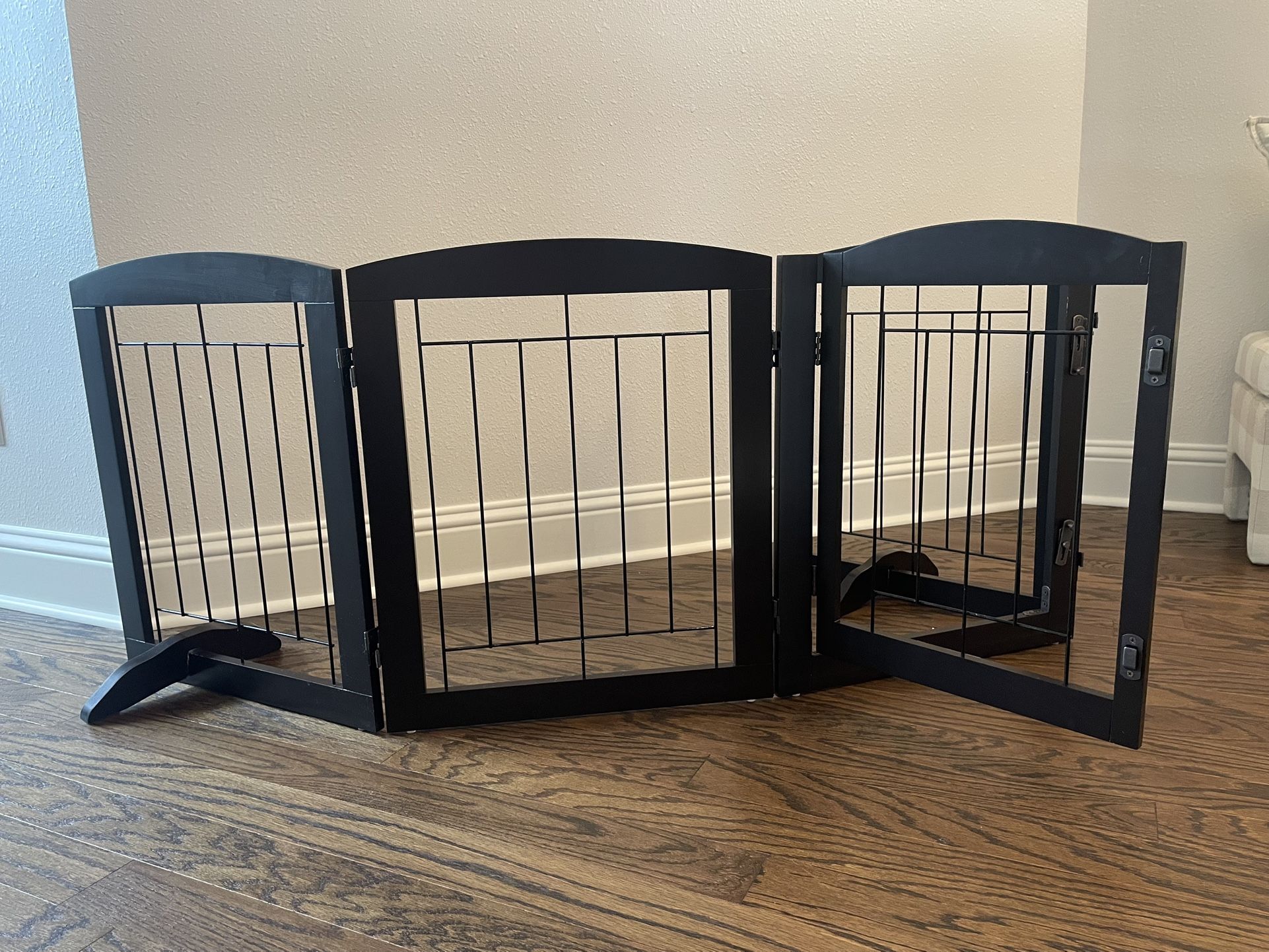 Freestanding pet gate with walkthrough door Four panels, one door, two locks in espresso brown. 80”L x 24”H Originally purchased on Amazon for $85 Cash only, no checks or cash apps. Pickup only at 1025 Campbell Road in Spring Branch. No delivery.