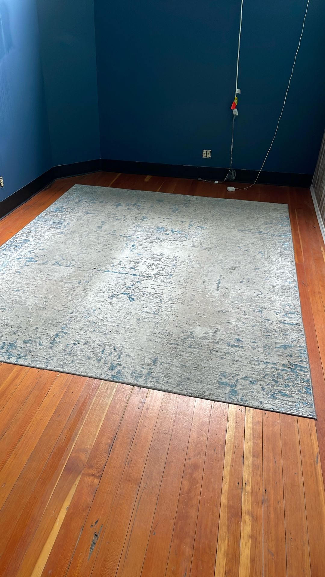 Beautiful rug, but needs a good cleaning. Was used in a massage studio so oils and lotions occasionally dripped on it over time. We just don’t have room for it in our new studio. Mixed blues and grays. Some shimmer depending on the light. Made in Turkey. No delivery.