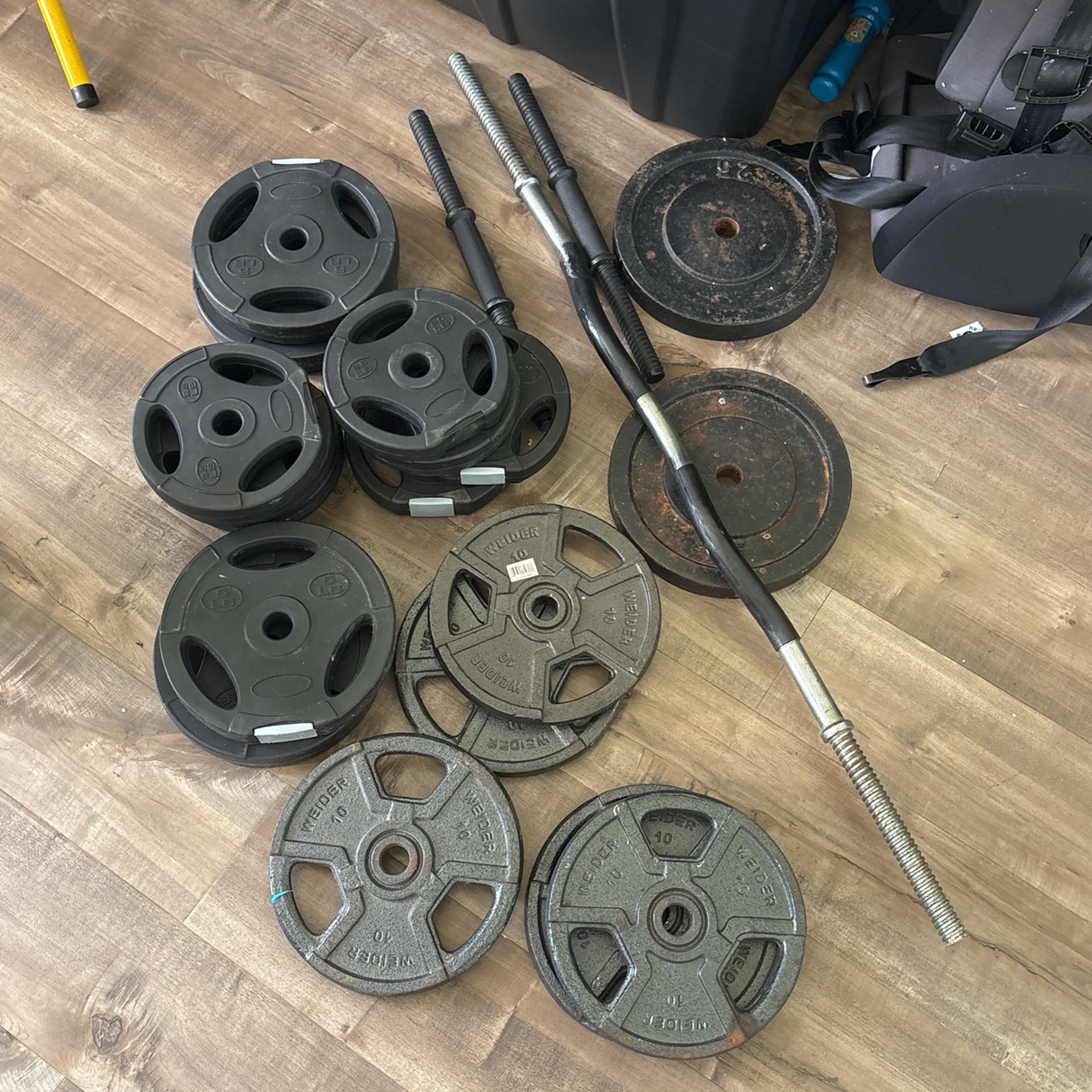 Take everything want to get rid of it ASAP!!! Comes with 5lb x4 2.5lbx8 10lbx5 25lbx2 Barbell Two dumbbell bars