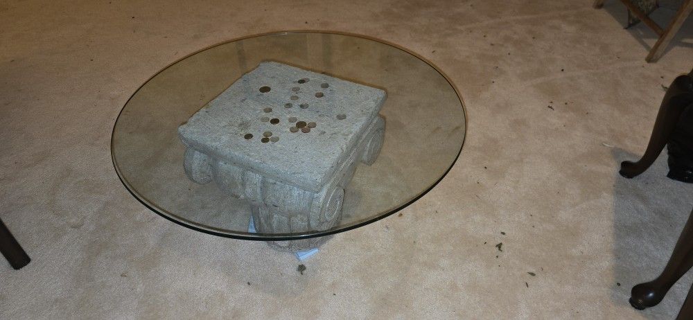Stone base, glass top, coffee table. 30 inch circle glass top 14 inch high and 13.5 inch wide stone piece