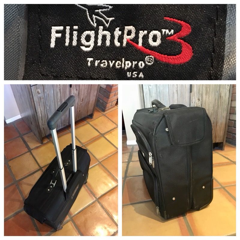 FlightPro 3 by Travelpro roller garment bag. Large and roomy. Excellent condition, with only couple of minor scuffs. 2 wheel, preferred by seasoned travelers, as it will not tip over when you use the clip to attach additional bags to it.