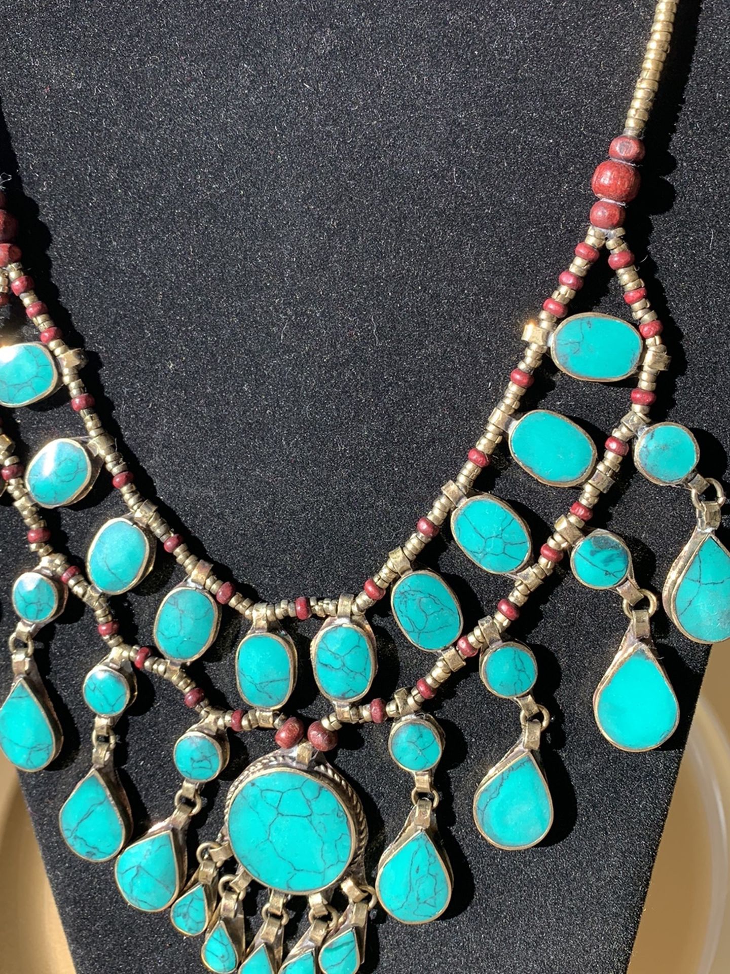 Natural Polished Gemstone Necklaces Middle Century from Afghanistan; Coral (red) Malachite (green) Lapis Lazuli ( Deep blue) Turquoise (sky blue)