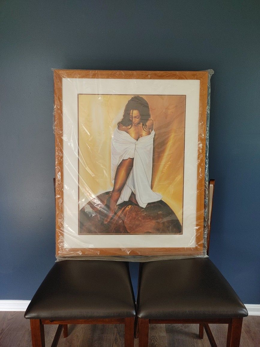 Framed 30.5 inch wide, 37.5 inch high picture of a woman standing on top of the earth - like a boss! Warm color palette makes a nice addition to many rooms.
