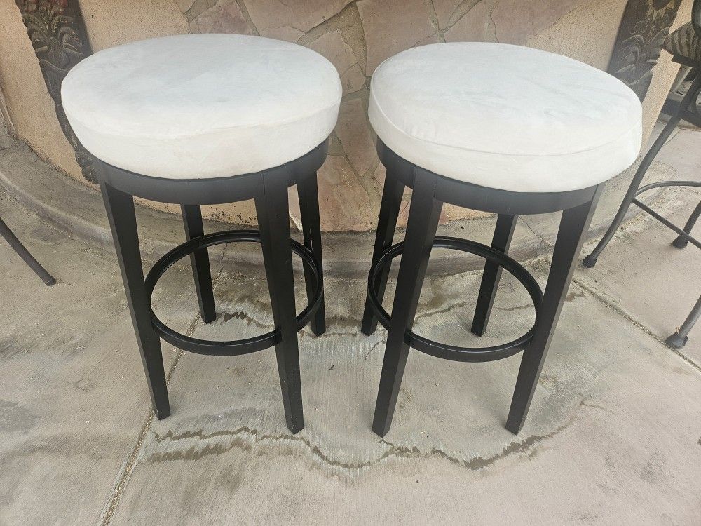 2 Pier 1 Bar Stools wood frame and tan cushion cover which is new. Thy looks great. 2.5 ft tall 16 inches round