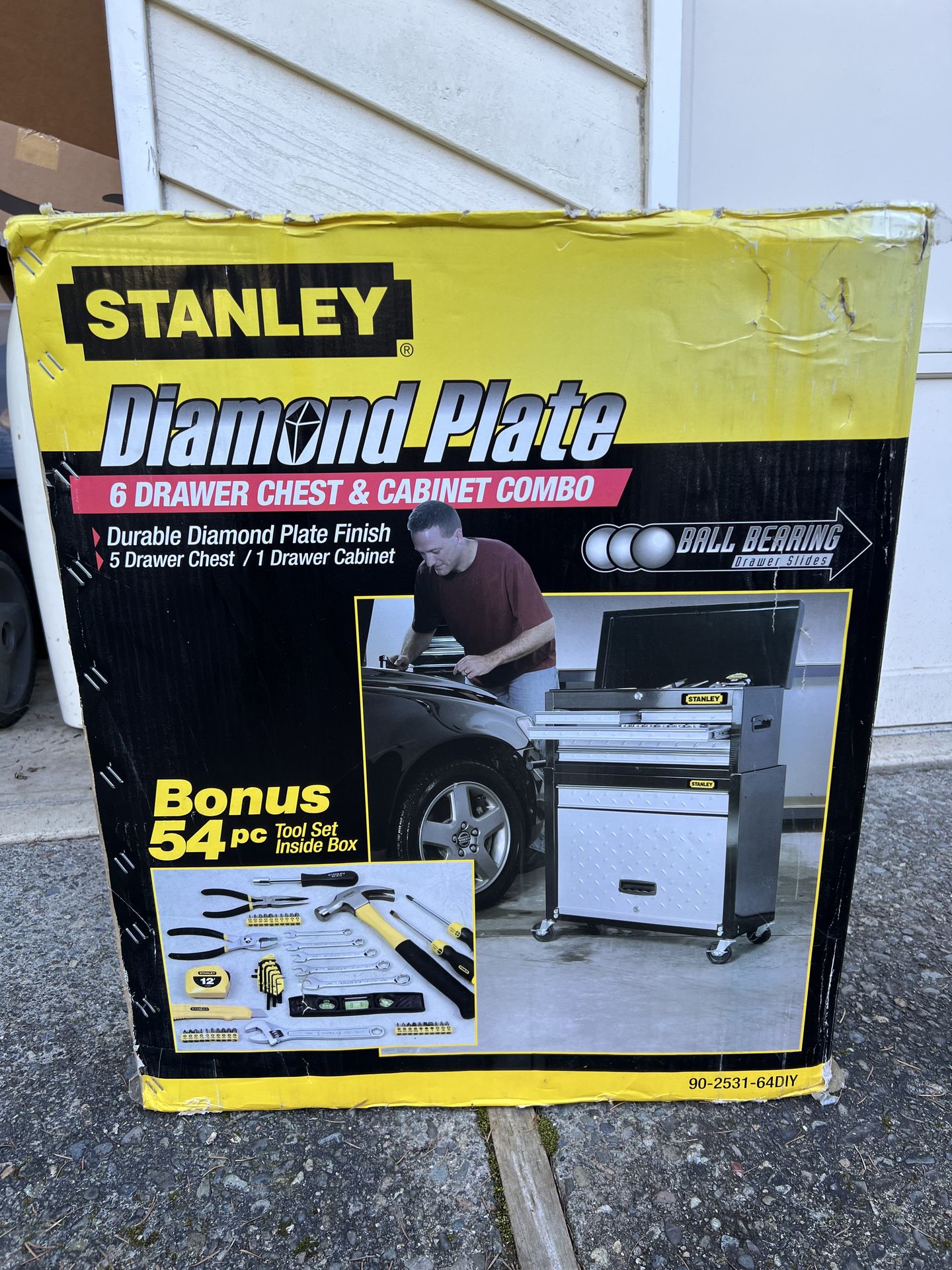 New/old stock-Stanley Diamond Plate 6 drawer Chest & Cabinet combo with 54 pc. toolset inside box. Please check out the photos for details