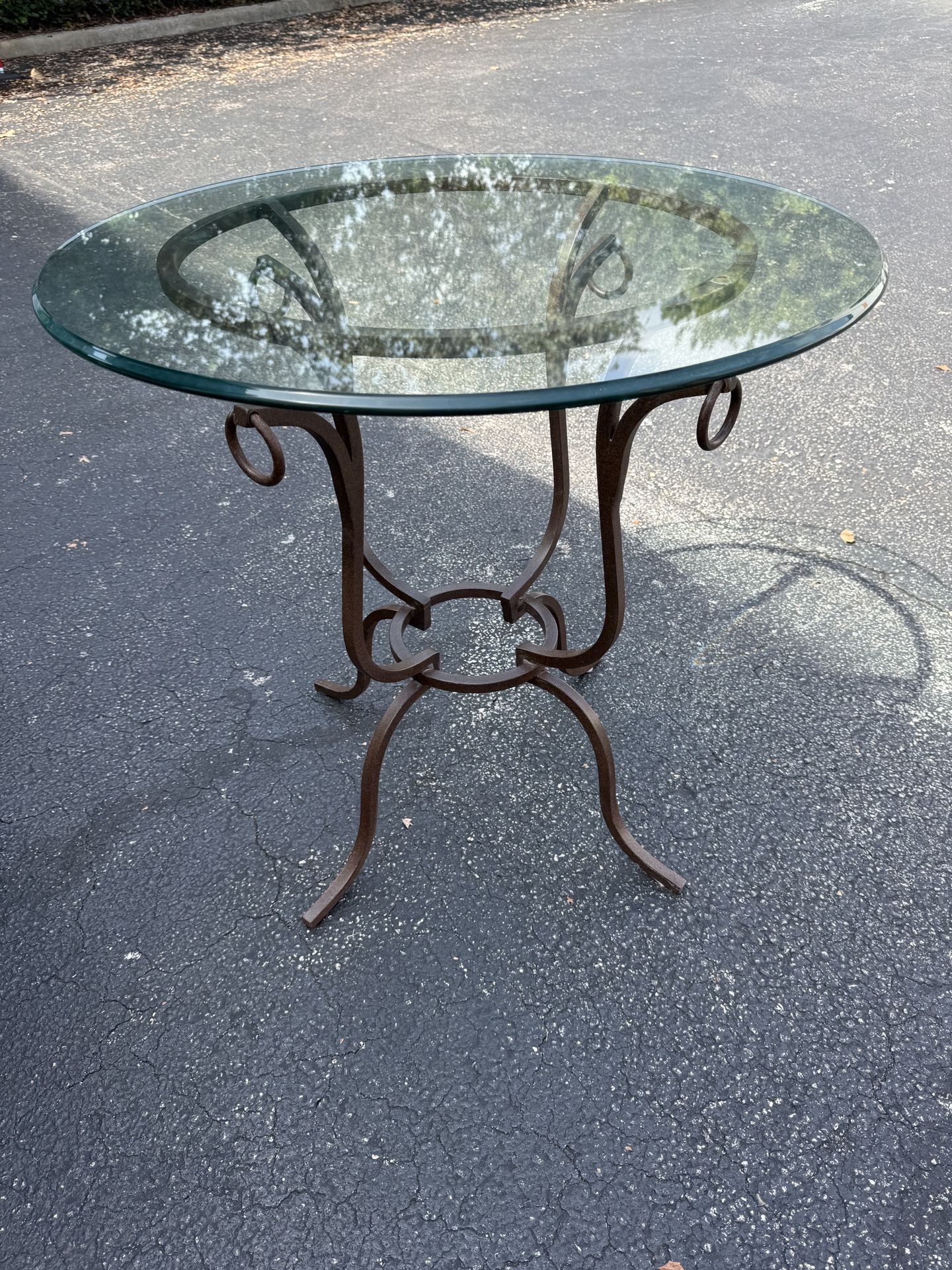 Accent table round glass top wrought iron metal base. From Ethan Allen. Fits any decor style 32” diameter 27” high