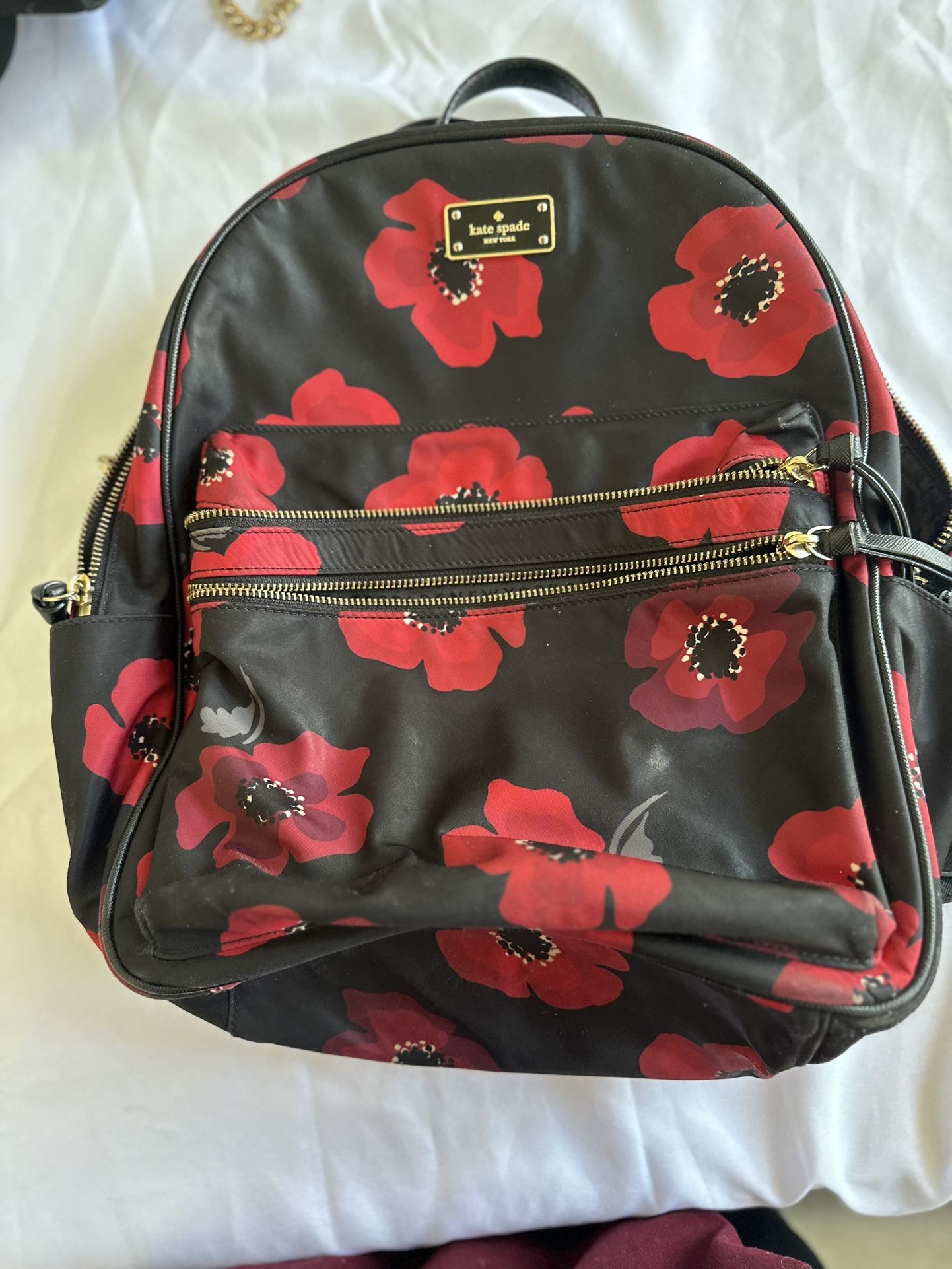 Kate Spade black floral backpack purse with red flower print and gold zipper accents. Stylish and functional with multiple pockets. Comfortable to wear and easy to carry. Authentic Kate Spade. Smoke-free home.