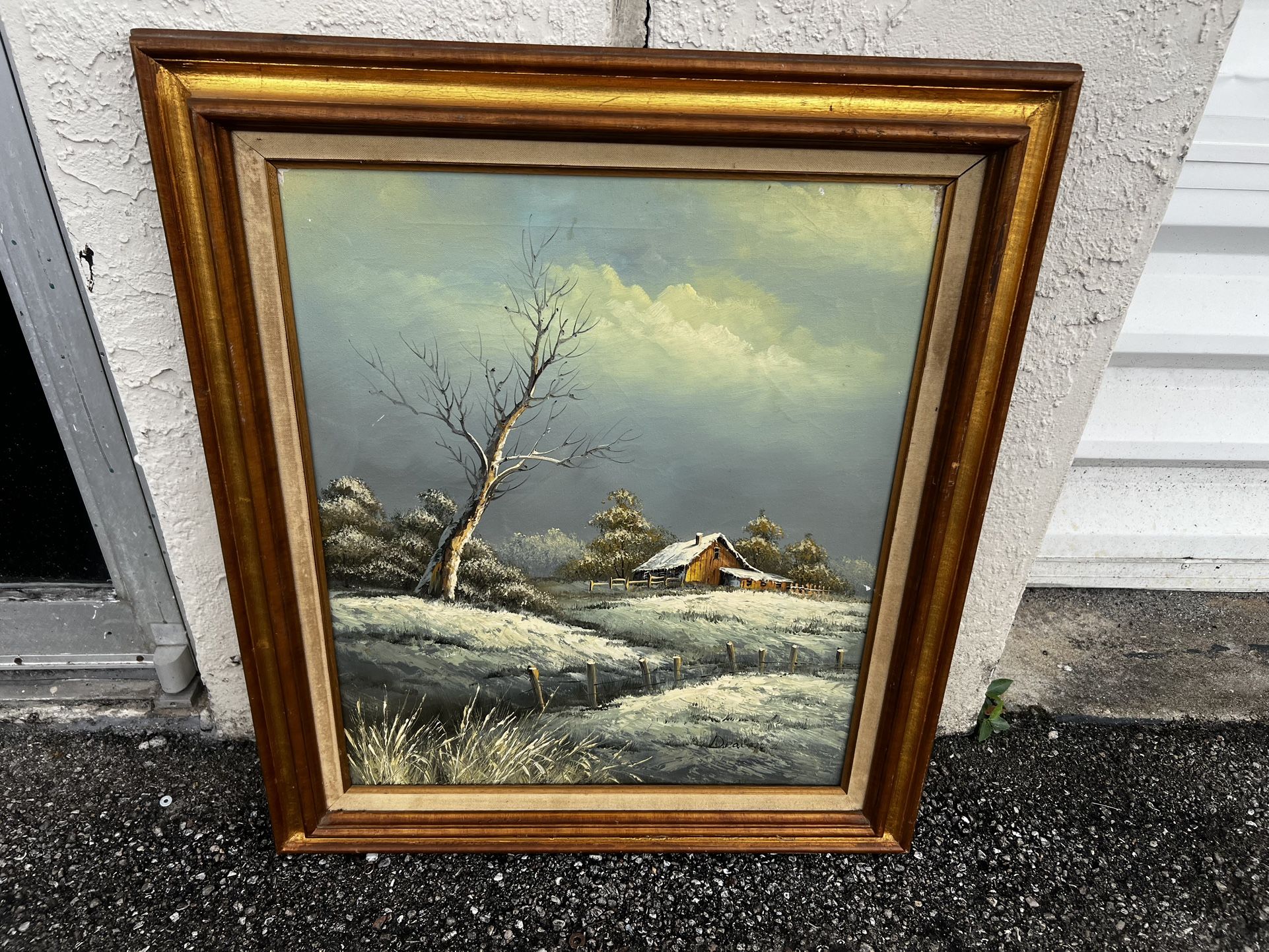 Vintage Countryside Rustic Winter Farm Scene Oil Painting by Deacon Total frame 26.5x30.5in Painting 20x24in