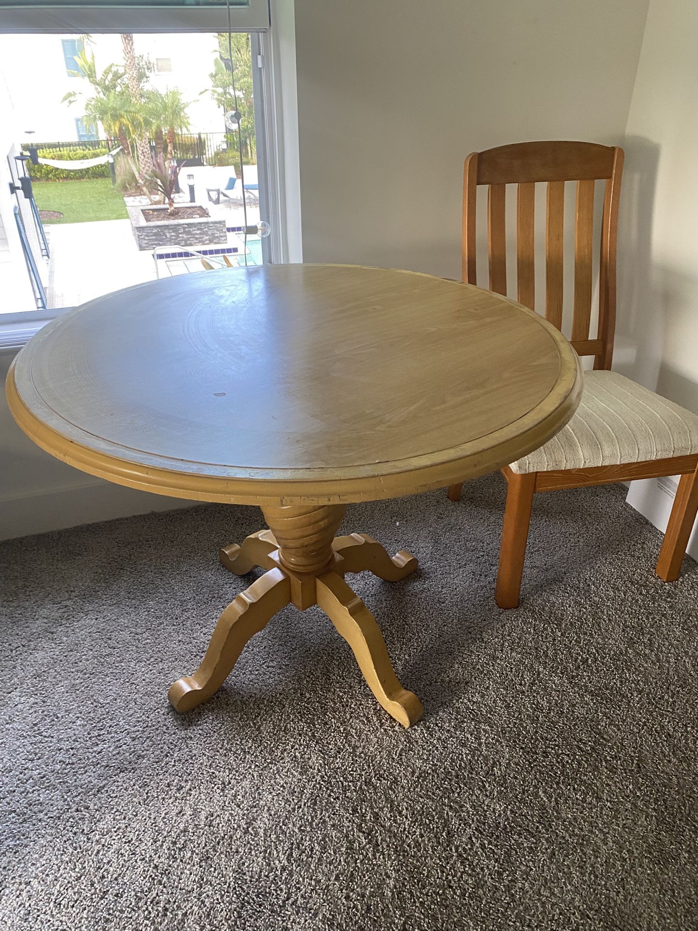 The solid wood table is in excellent condition, I think you'll like this light, beautiful shade. You can repaint it with a different varnish if you wish. That's up to you. It has a very beautiful, woven leg, and the chair comes as a gift. This is a sturdy table that will last for ages and has a very comfortable height.