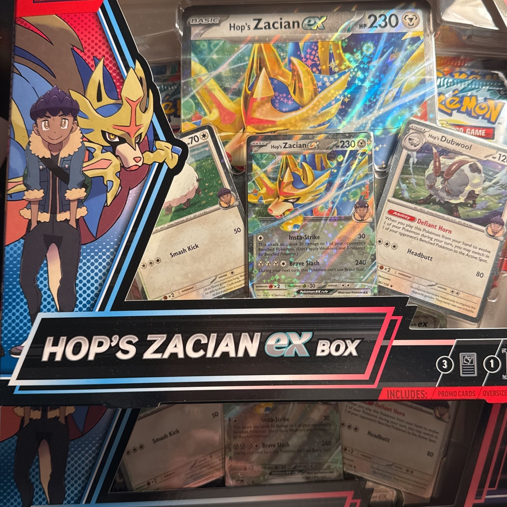 Brand new, sealed Hop’s Zacian EX box set, in excellent condition. I have four (4) total. Each box contains four (4) booster packs (2 Journey Together, 1 Surging Sparks, and 1 I believe Obsidian Flames), three (3) promo cards, one jumbo Hop’s Zacian ex, and stickers. Price is firm. Cash / Zelle OK. I am open to trades for WOTC Pokemon singles or *some* sealed Pokemon products. Cheers!