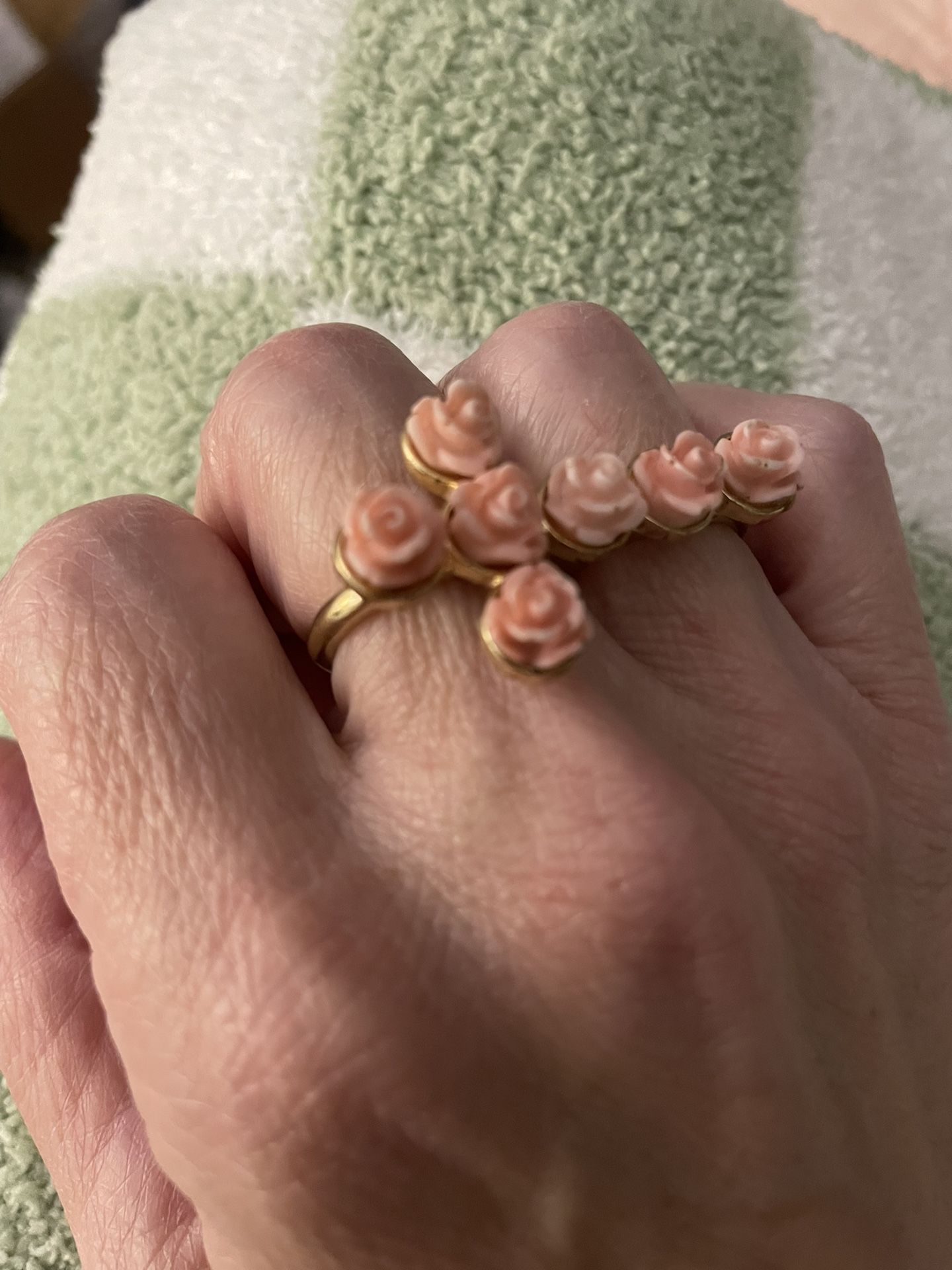 Vintage pink ceramic roses on double finger ring. Size 6.5/7.5.