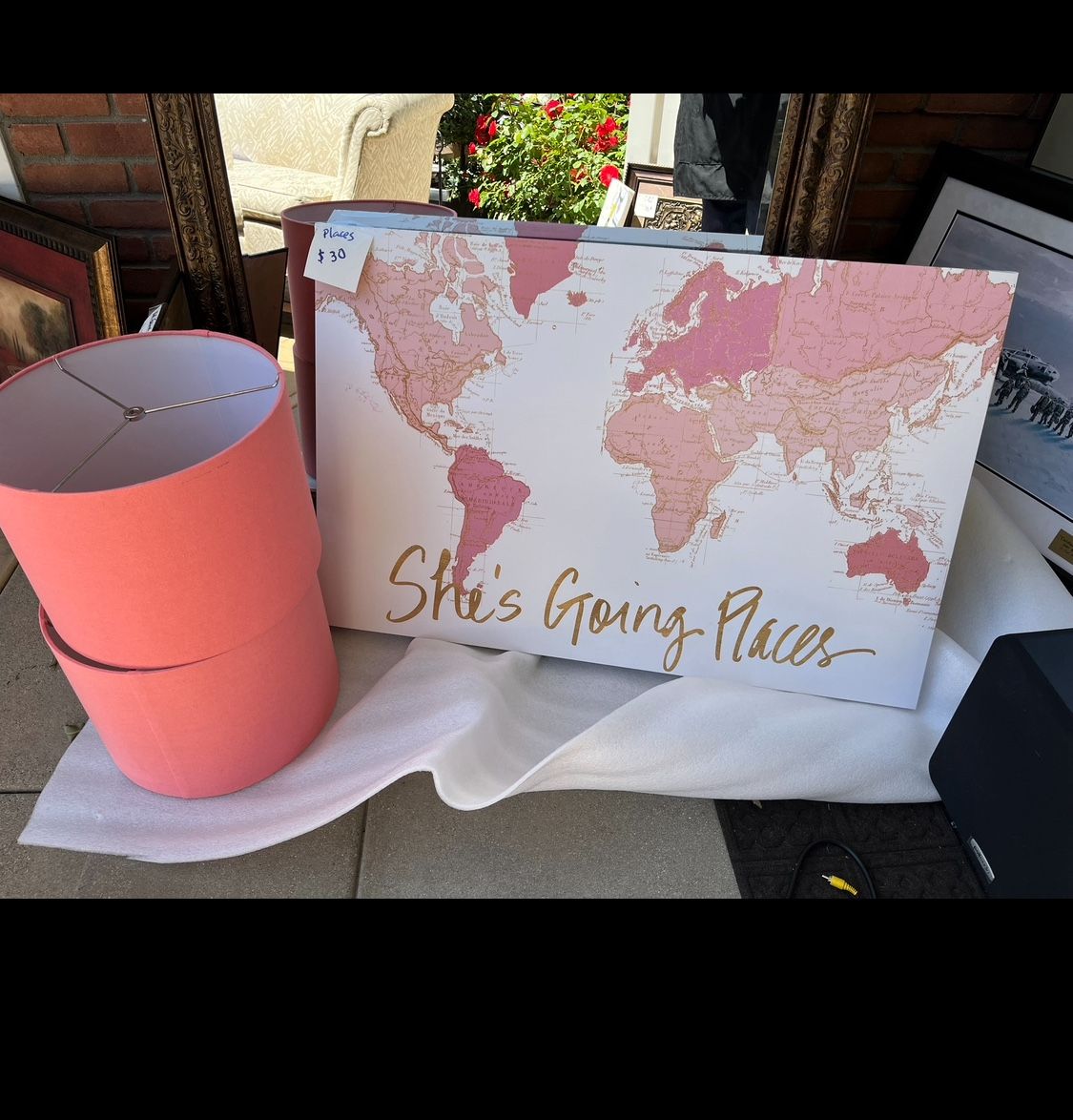 World Map Canvas And 2 Coral/pink Lamp Shades