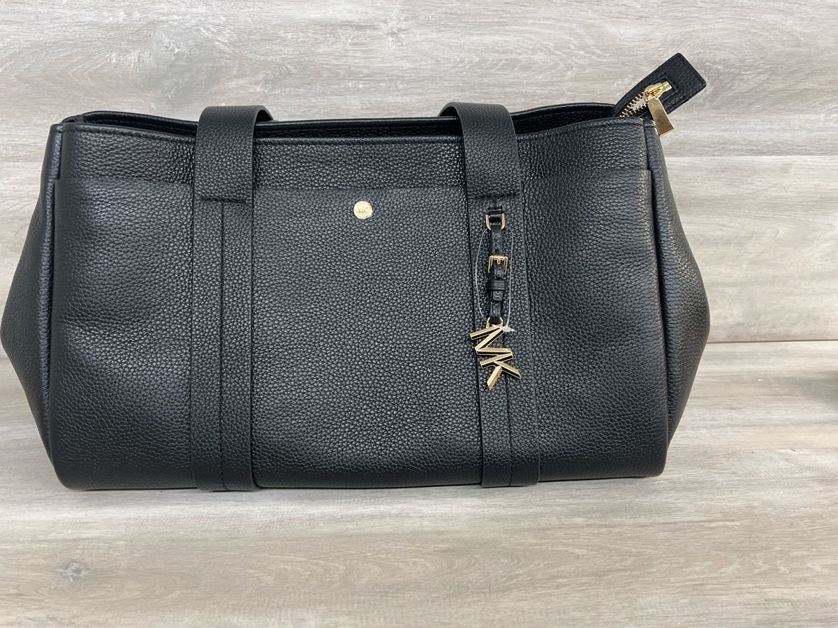Michael Kors Black Pebbled Leather Tote Bag With Gold Tone Hardware. This structured tote is made from durable black pebbled leather with a clean, classic silhouette. Features dual leather top handles, a full top zip closure, and gold tone hardware accented by a hanging MK logo charm. Interior offers ample space for daily essentials, work items, or travel use. Condition is pre owned with light cosmetic wear consistent with normal use, including minor surface creasing. Leather remains supple and structure is intact. A reliable everyday tote that does exactly what it’s supposed to.
