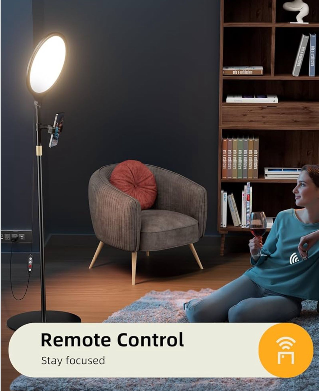 Brand New 10.5" Ring Light with Stand and Phone Holder - 72" Tripod for iPhone with Light, Professional Led Ringlight for Video Recording/Make up/Streaming, Full Screen Light Ring for YouTube, Tiktok (Black) Features • Upgraded Panel Light: Features a larger round surface, offering superior illumination compared to traditional ring lights. This key light provides soft, even lighting that naturally smooths skin tones and eliminates harsh shadows • Flawless Light Ring Illumination: The ring light tripod for iPhone delivers soft, even lighting that reduces glare and harsh shadows, resulting in flattering, natural-looking images • Endlessly Customizable Lighting: Choose from 3 lighting modes (Warm 2900K, Cool 6000K, and Neutral 5000K) to perfectly match your creative vision or ambient environment, ensuring your subjects are always bathed in flattering, controlled illumination • Versatile Adjustable Tripod: Built from durable aluminum, this ring light tripod extends from 39 inches to 72 inches (top of light head), allowing you to easily customize the height for the perfect shot • Wireless Remote Control: Capture stunning selfies or group photos from up to 30 feet away. The phone tripod with ring light also includes a 5V 3A adapter to ensure a stable, reliable connection • Sleek Design & Versatile Functionality: With its minimalist design, this LED ring light also doubles as a stylish floor reading lamp for your living room or bedroom.