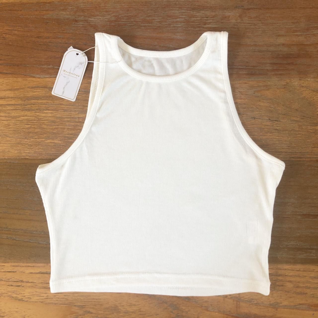 White halter crop top, brand new. It’s a little sheer, best shown on the last picture. 95% Rayon, 5% Spandex. Size small, fits x-small / small. Length 14”.