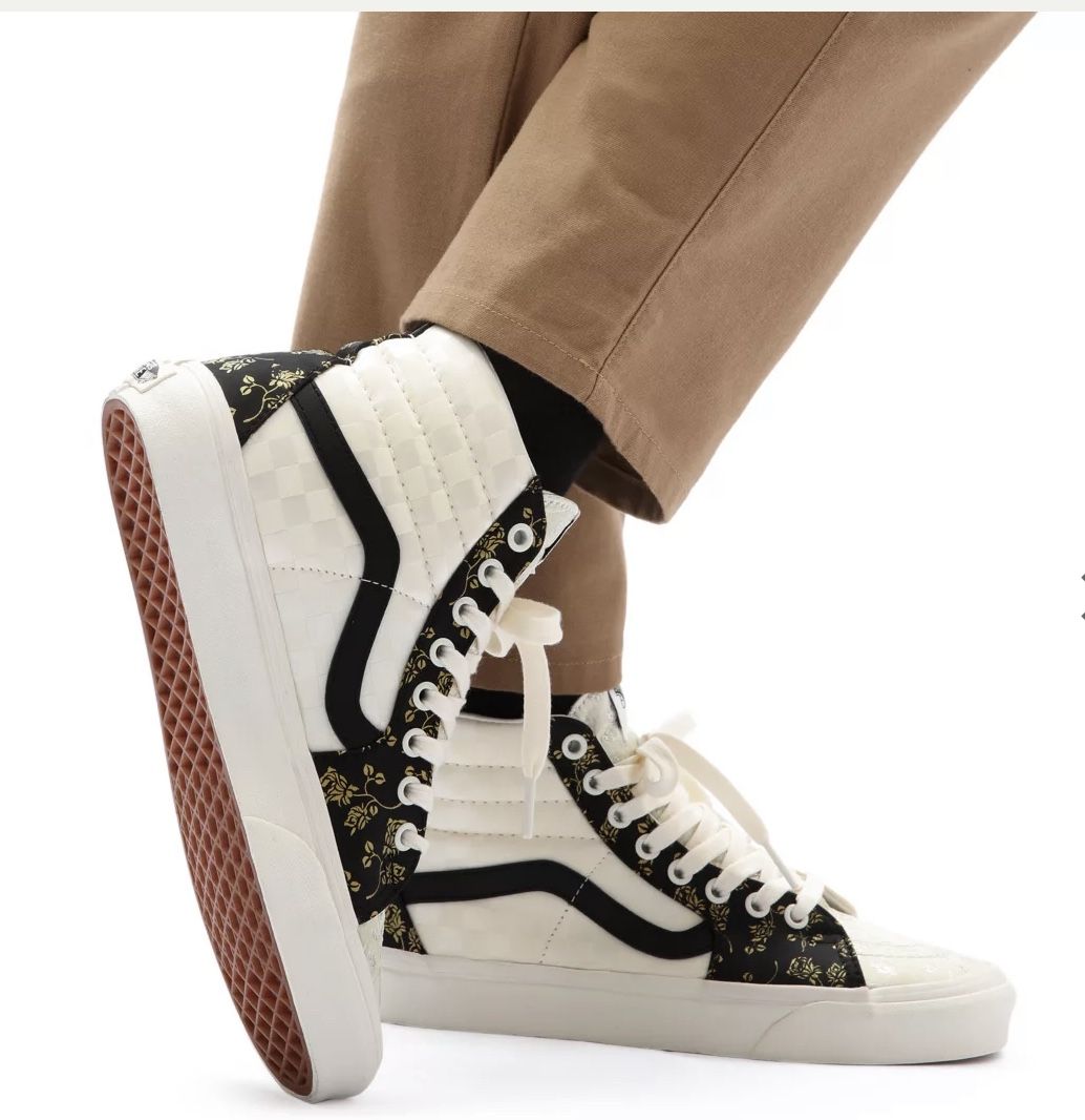 New with tags VANS BROCADE SK8-HI Sneakers Size 8 As only the second model featuring the recognizable marker formerly known as the “jazz stripe,” the Sk8-Hi brought a whole new look to the Vans family. Building on that first legendary high top, the Brocade Sk8-Hi features mixed brocade textiles and leather for an elevated patchwork design. This lace-up shoe also includes re-enforced toe caps, supportive padded collars, and signature rubber waffle outsoles. Composition: Textile, Leather