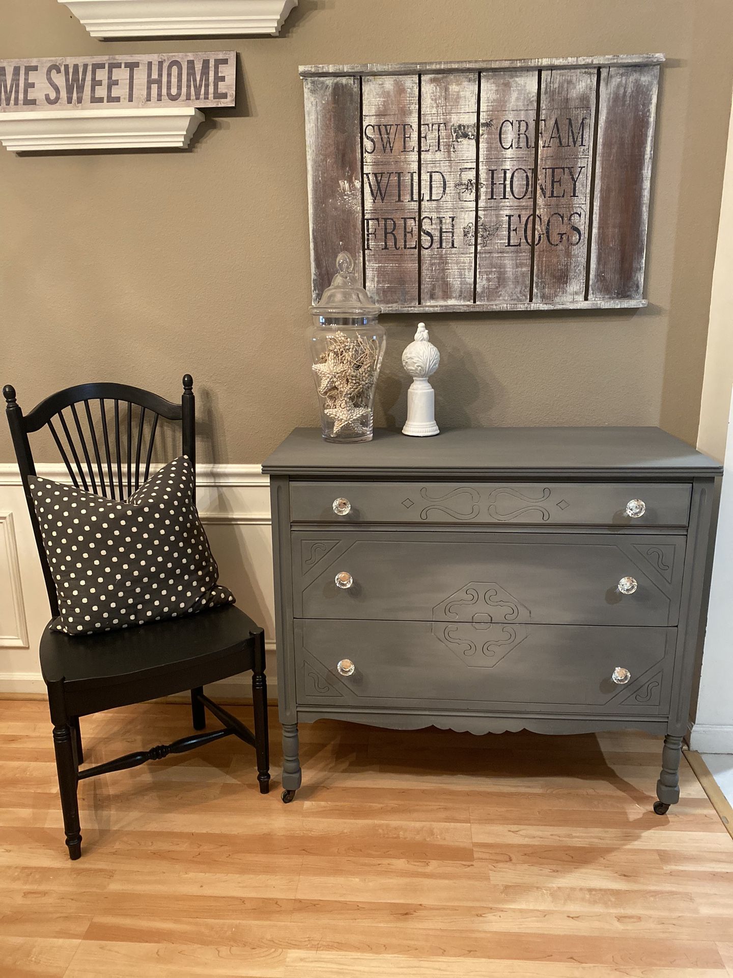 refinished vintage dresser dovetail joints upgrades hardware with clear glass knobs chalk painted/waxed Dixie belle products 40 across 19 depth 36 high if interested need quick pick up no holds asking 175.00 I refinish antique furniture and also do consignment work .. i have other dressers and side tables in inventory if you are interested . if you have any questions please ask