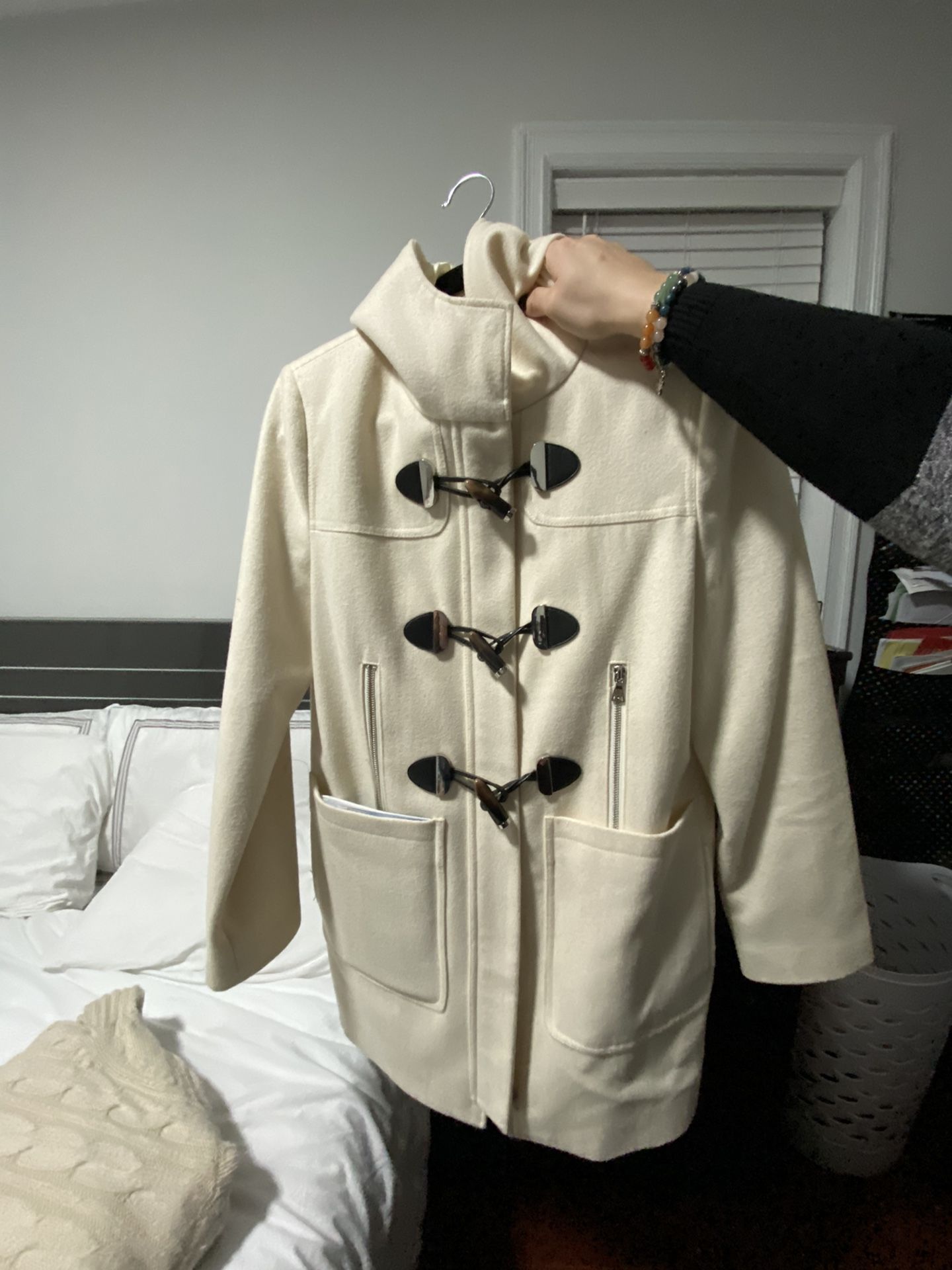 S/p Express fashion coat with zipper buttons, toggles and a hood . Pick up only