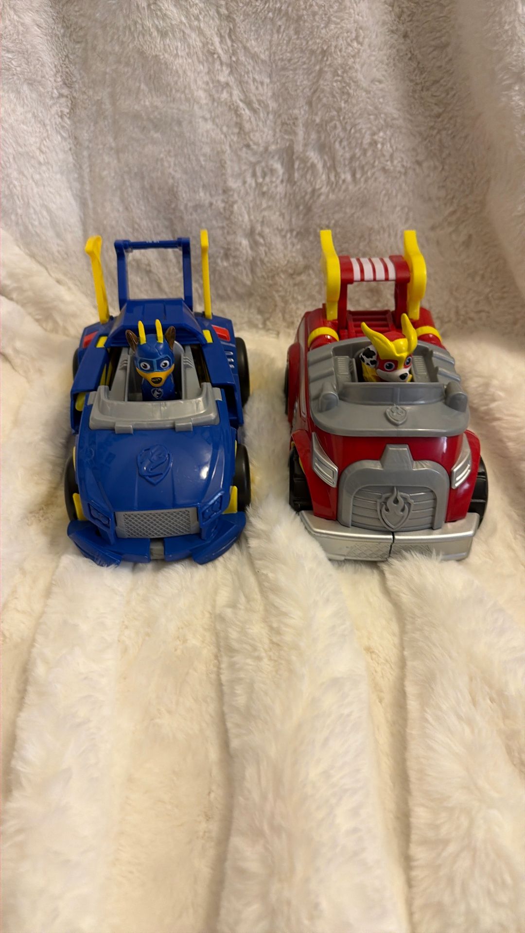 Comes with 2 transforming vehicles and 2 pups. Chase missing one shooter. And Marshalls added water cannons.