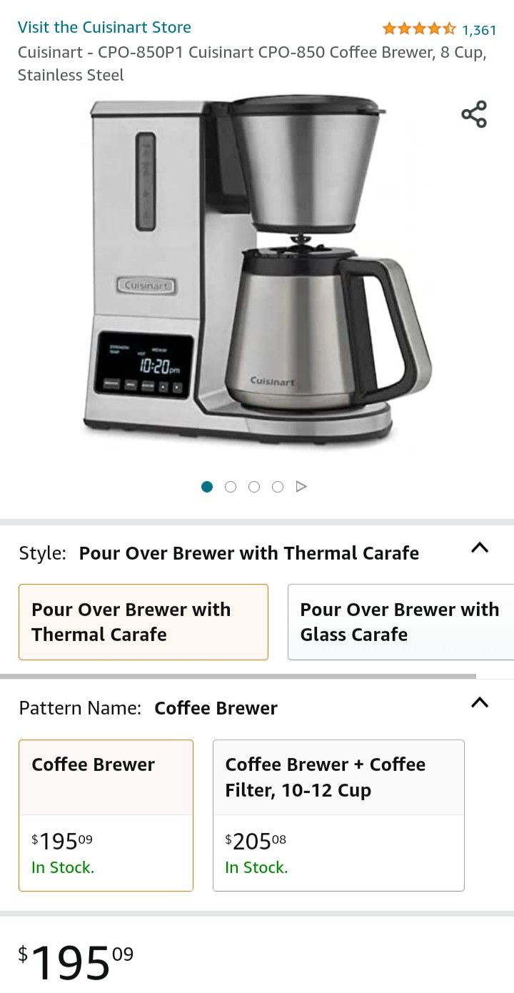 Cuisinart Pour Over Coffee Maker.. Thermal Stainless Steel Carafe