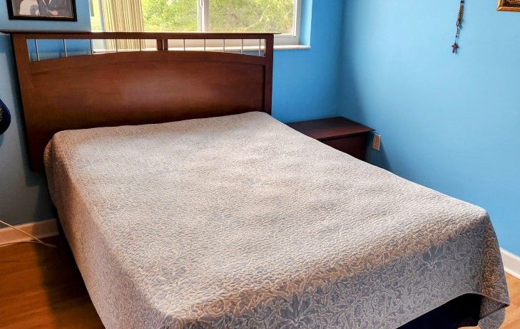 Bed, Nightstand, Bedding, Matress, boxspring, both with sheet protectors . Bed metal frame with wheels. Also desk with book case.