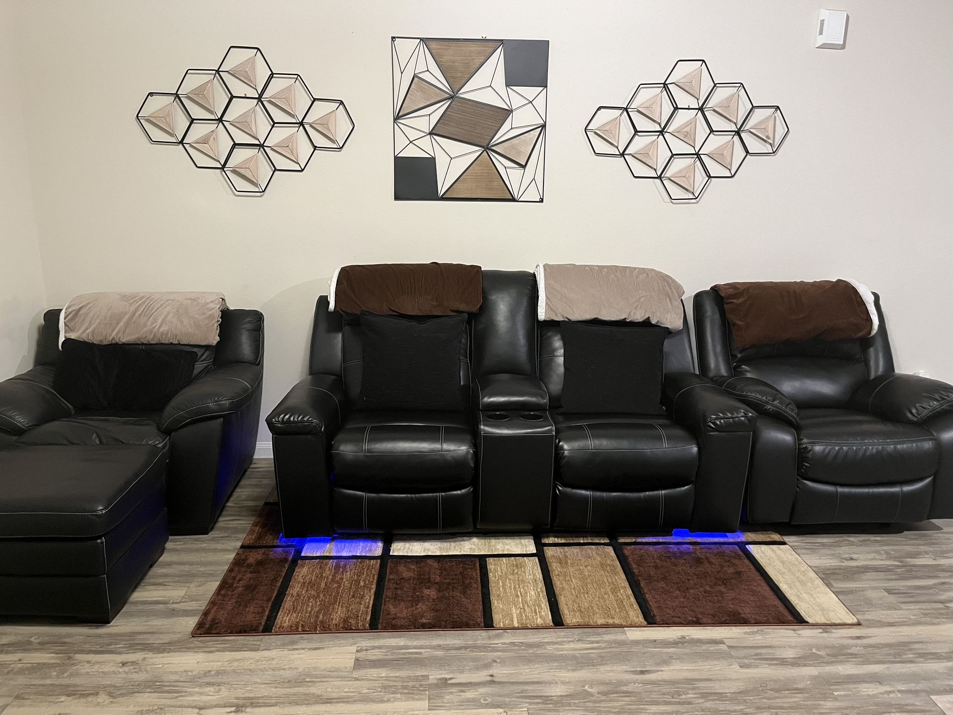 Lounger, theater loveseat, recliner, rug, throws, and wall decor included