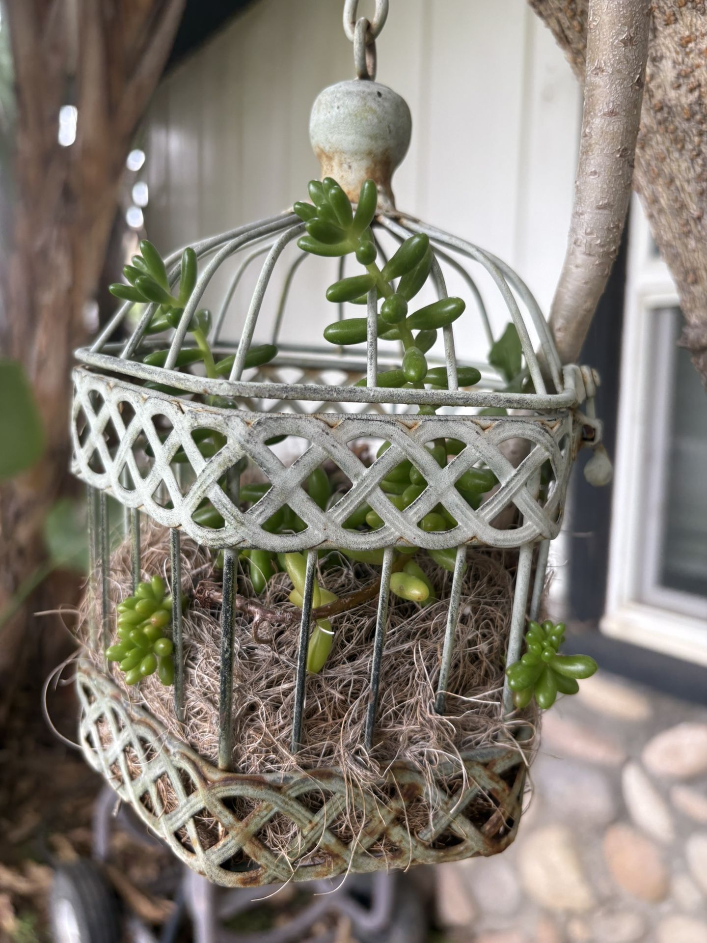 Lovely decorative hanging metal birdcage with a mix of succulent plants growing inside. Well rooted happy plants, have been growing several years. Base has coco fiber to prevent soil from coming out. Loves patio or a shady tree to hang in π Has a great charming distressed shabby chic look. With plants measures 5β W X 22β H $12 Cash only Pick up only Riverside 92503 Van Buren/ Arlington area Hanging plants, bird cage decorative plant arrangement
