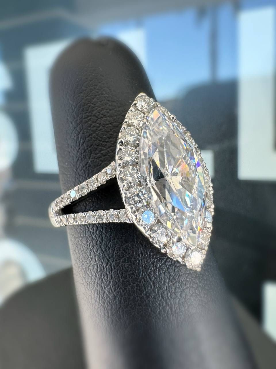 This gorgeous ring is made of 18k solid white gold with 0.84CTW natural diamond stones round shape E color, Vs-Si mixed clarity and 2 carat of CZ stone in the middle marquise shape. Size of the ring: 6. Total weight: 6.6 grams. It is very unique and gorgeous piece. Perfect gift! β€οΈππ We buy Rolex and Audemars, patek . Do layaway in vipawn Boca Raton π₯ππΈ