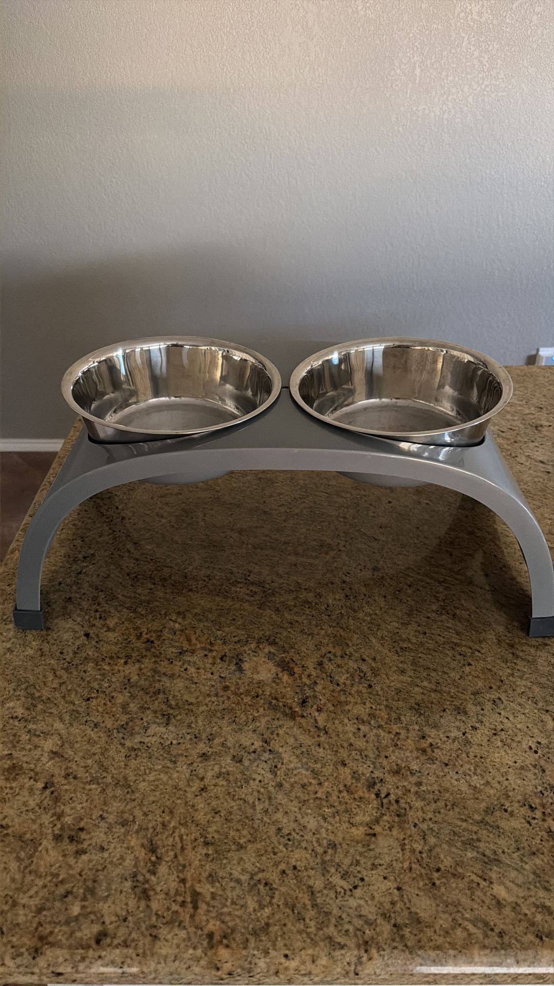 Pet Champion large dog feeding station with stainless steel bowls. Bowls are 8” across. Stand is 21” wide. Cross posted