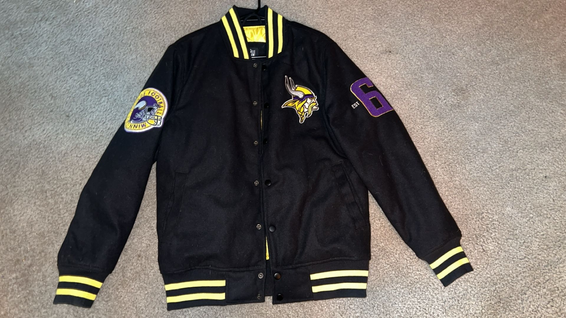 NFL Minnesota Vikings jacket All black, yellow interior All patches are embroidered into jacket 3 pockets ( one on inside ) Worn approximately 2-3 times Great condition Best offers