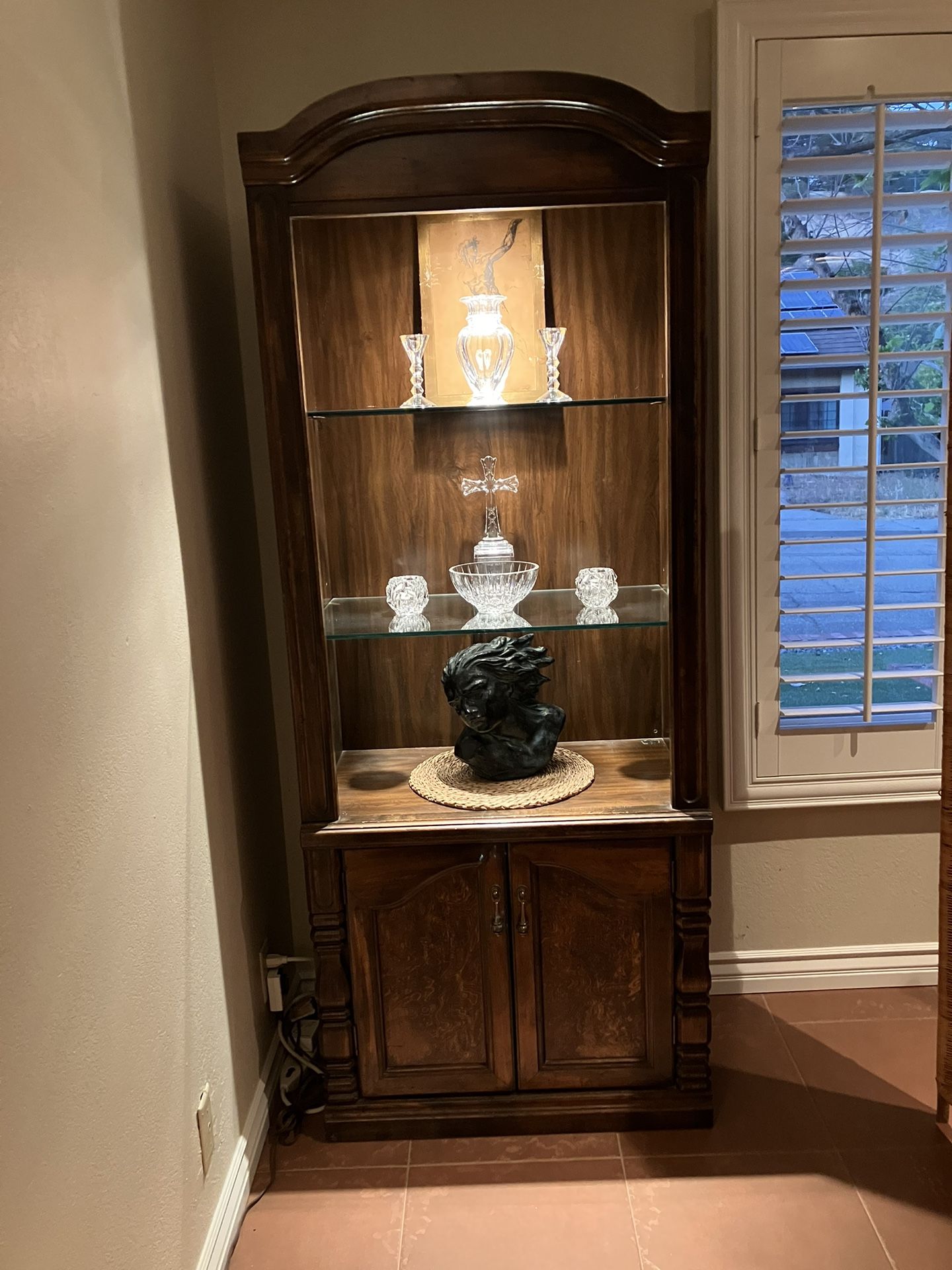Dark wood illuminated curio/book cases with double door storage base . 1/4 inch polished glass shelves . 75 inches height, 30 inches wide, 17 inches deep.