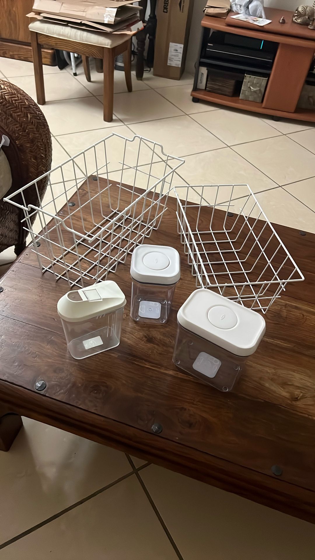 Seven pantry storage items, good condition. Two wire storage baskets, four plastic airtight and one is glass. First pic shows 5 items, the second pic the other 2 items, they are in total 7. I’m around 137 Ave and 88 St Kendall