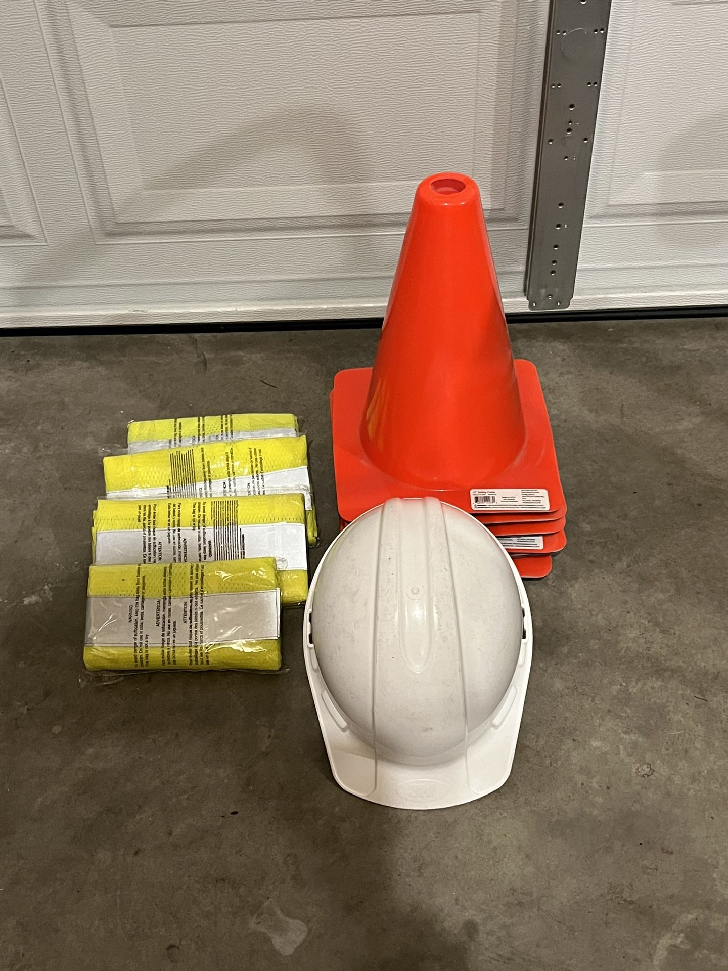 Qty 6 new safety cones NEW Qty 4 new safety vests NEW Qty 1 Hard hat only used a few times Great deal! Thank you
