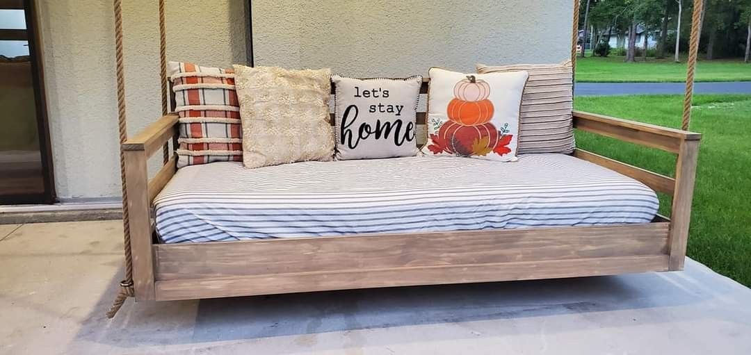 Custom Daybed swing. You can order it and it will be ready in a week. This is the unstained frame only and does not include the mattress, pillows or rope in pictures. I will stain it for $60 in your choice of stain. It will have the hanging hardware installed on the swing but will not come with hardware for attaching to a ceiling as there are to many variables. I also can not help with install due to liability. We are located in Wesley Chapel, Fl For more information please at me know.