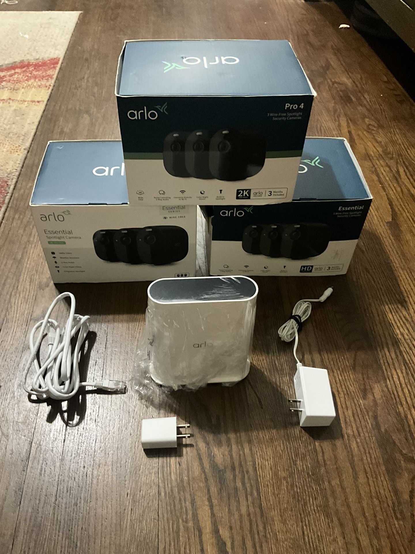 6 new Arlo cameras with 6 white silicone protectors and 1 hub recording All in the box I buy for my shop and close no need more Home security shop stroller woman building