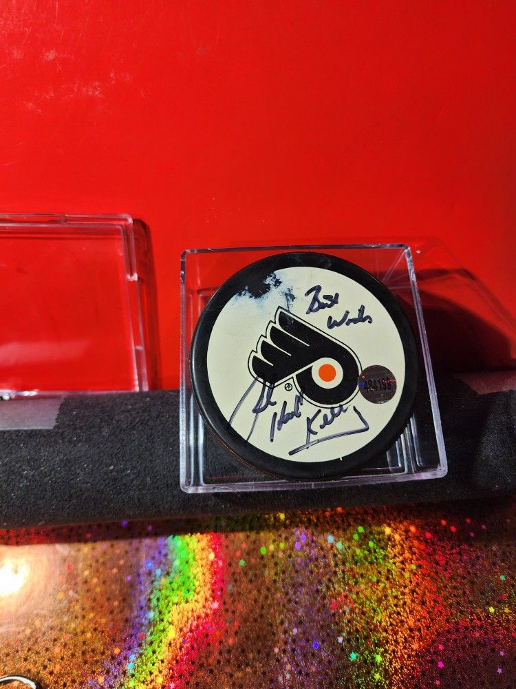 This is a Philadelphia Flyers autographed hockey puck, signed by Bob Kelly The signature at the bottom left is identifiable as Bob Kelly, who played for the Flyers from 1970 to 1980. The puck features a "Genuine" hologram which is used for authentication purposes. The puck is displayed in a clear protective case included.