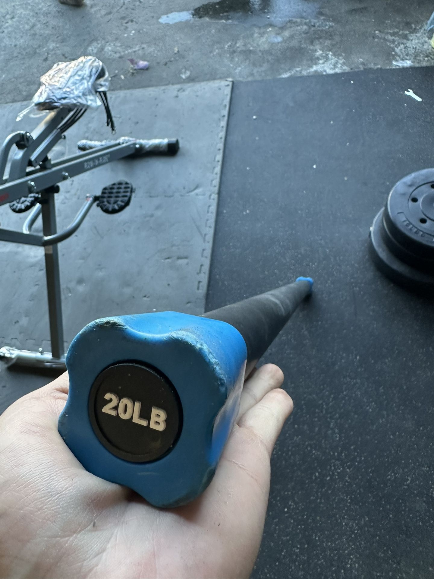 The bar is 20lbs I also have 30lbs as well Super high quality is Rubber Good for indoor and outdoor use Come brand new!!!