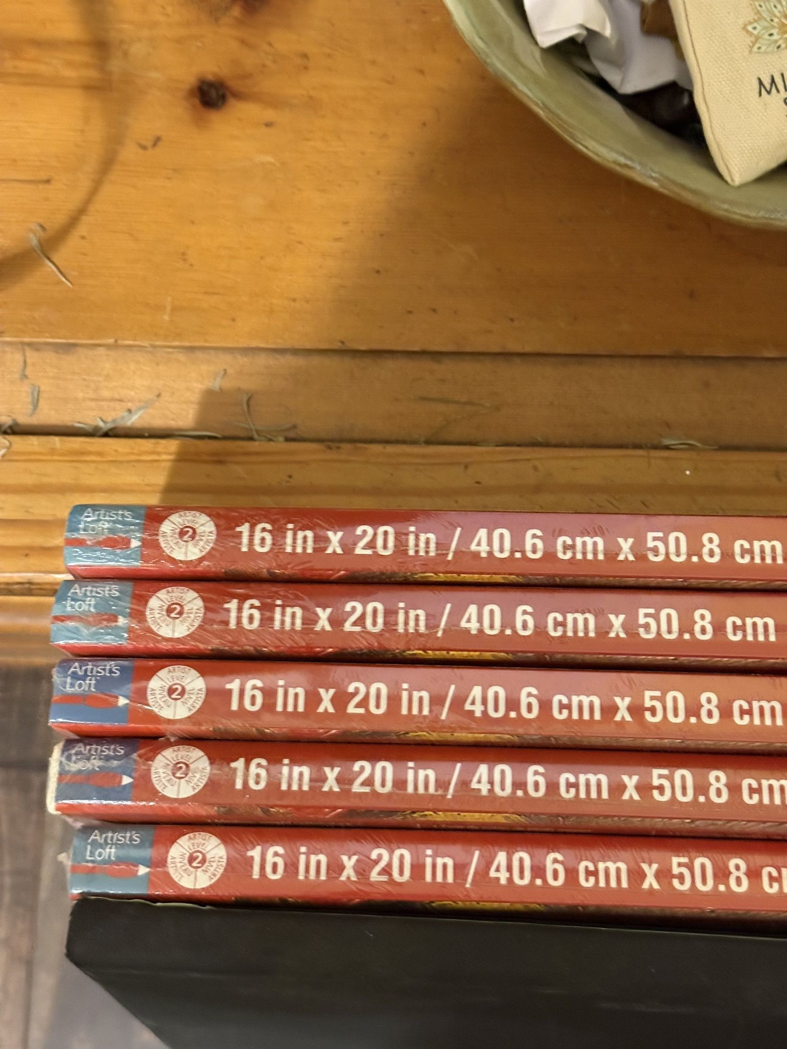 Mixed sizes and Grade Levels. All wooden back, still in wrapper. Sizes include 20x24, 16x20, 12x24, 18x24, 12x16, 12x36, 8x8, 12x12, plus round ones. There are a few black. Closed my paint room so selling my canvases. Can meet anywhere from Cleveland to Kingwood 59 area. Selling as a lot only. Photos of all available.