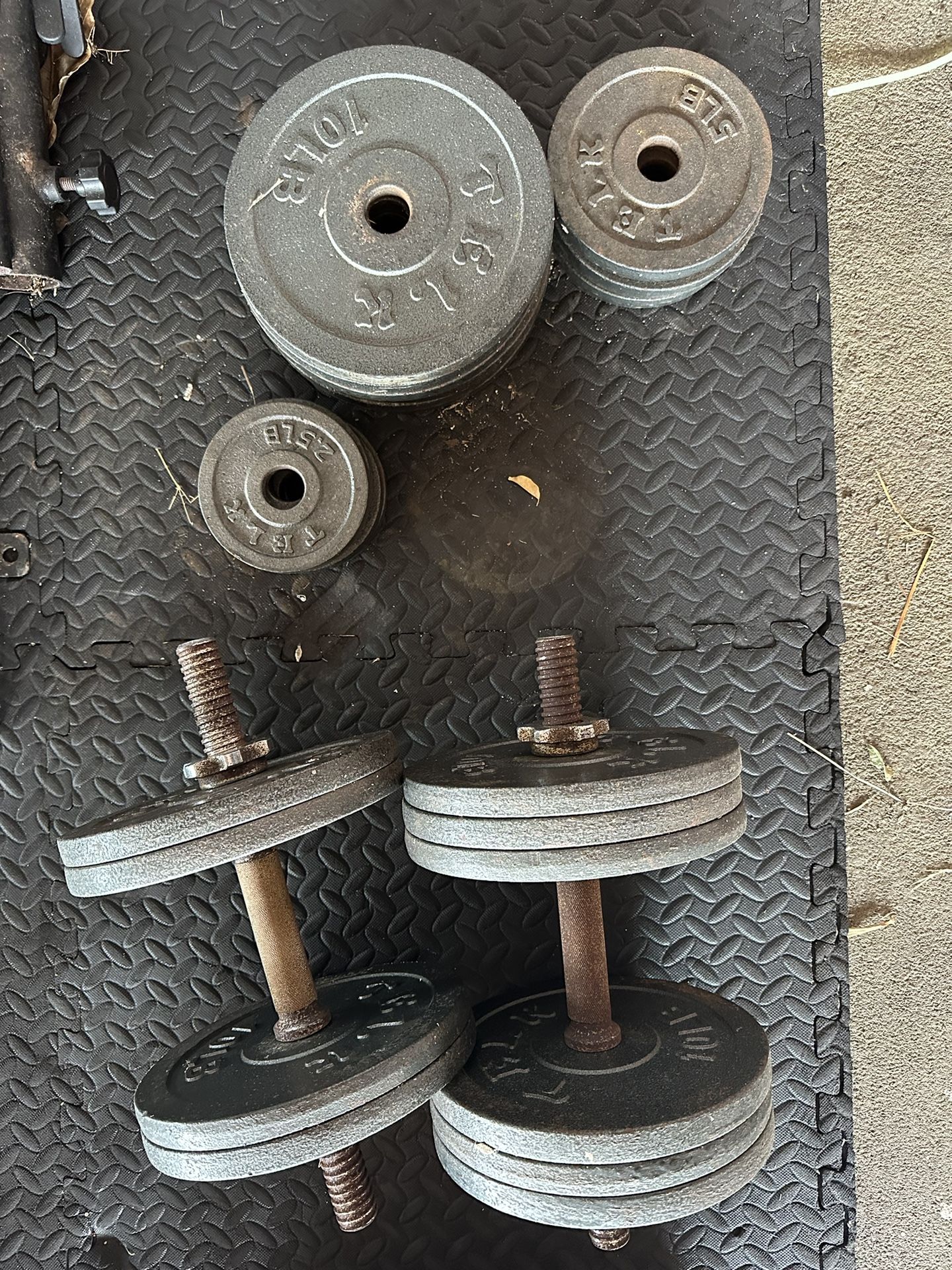 ADJUSTABLE SET OF 2 DUMBBELLS - 5 lbs to 100 lbs in 5-lbs increments. Includes TWO 15.75”x1.15” handles, SIXTEEN 10-lb plates, FOUR 5-lb plates, FOUR 2.5-lbs Plates, and FOUR Collars 100% CAST IRON WEIGHT PLATES Has rust on top but no problems with use.