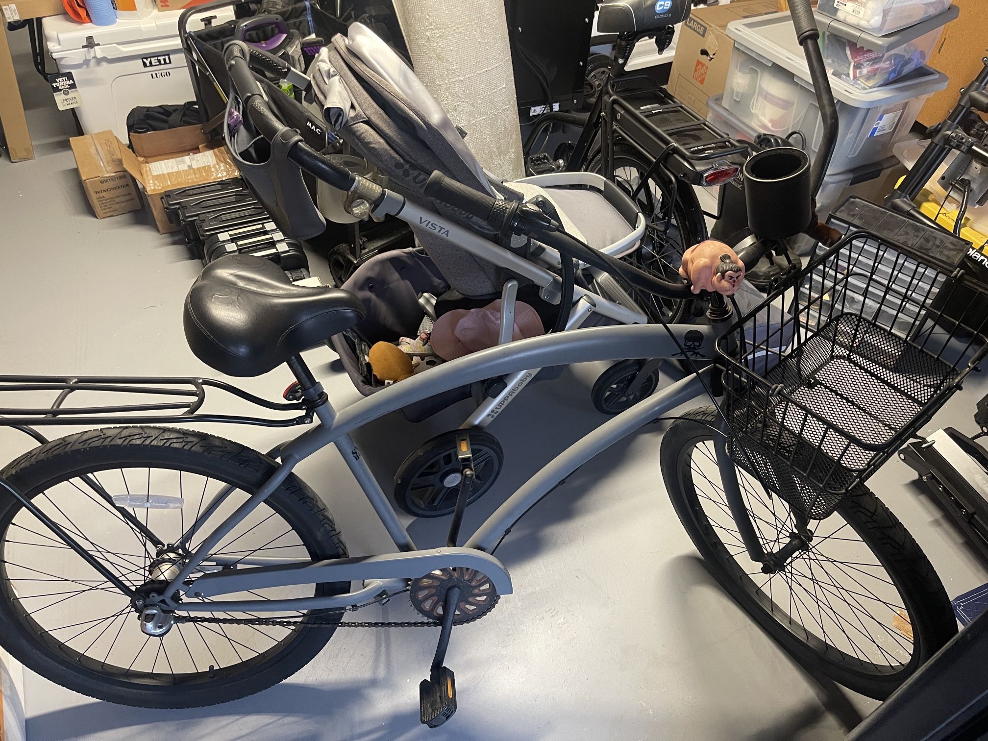 3 speed with coaster brakes. Comes with cup holder, basket, and rear rack. Has surface rust from living at the beach but works fine.