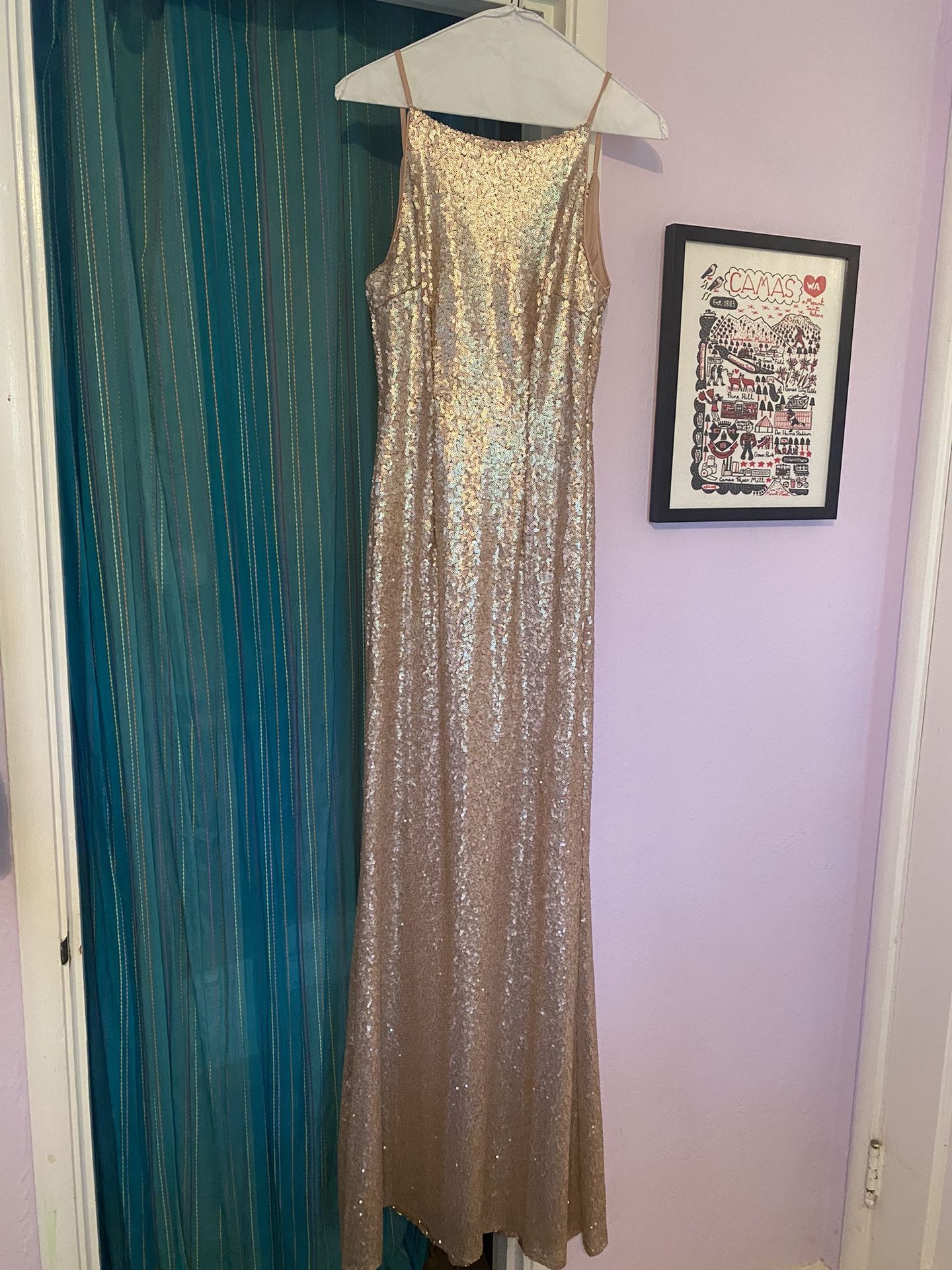 Gold sequin prom dress with an open swooped back. Size small.