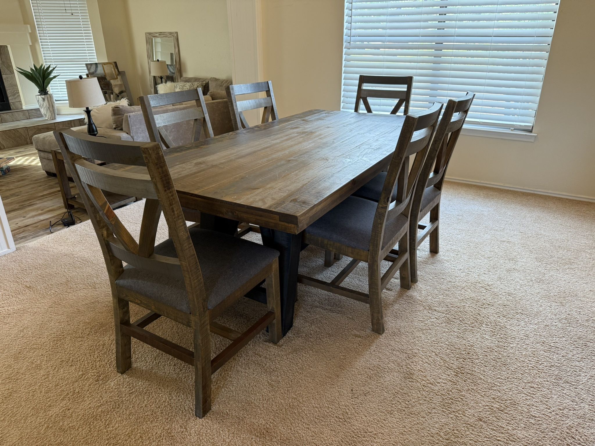 Beautiful solid wood, brand new condition. Dining room table and six wooden chairs with comfortable fabric cushions. Made in Mexico and barely used. Would love to keep them but they are too big for my home.