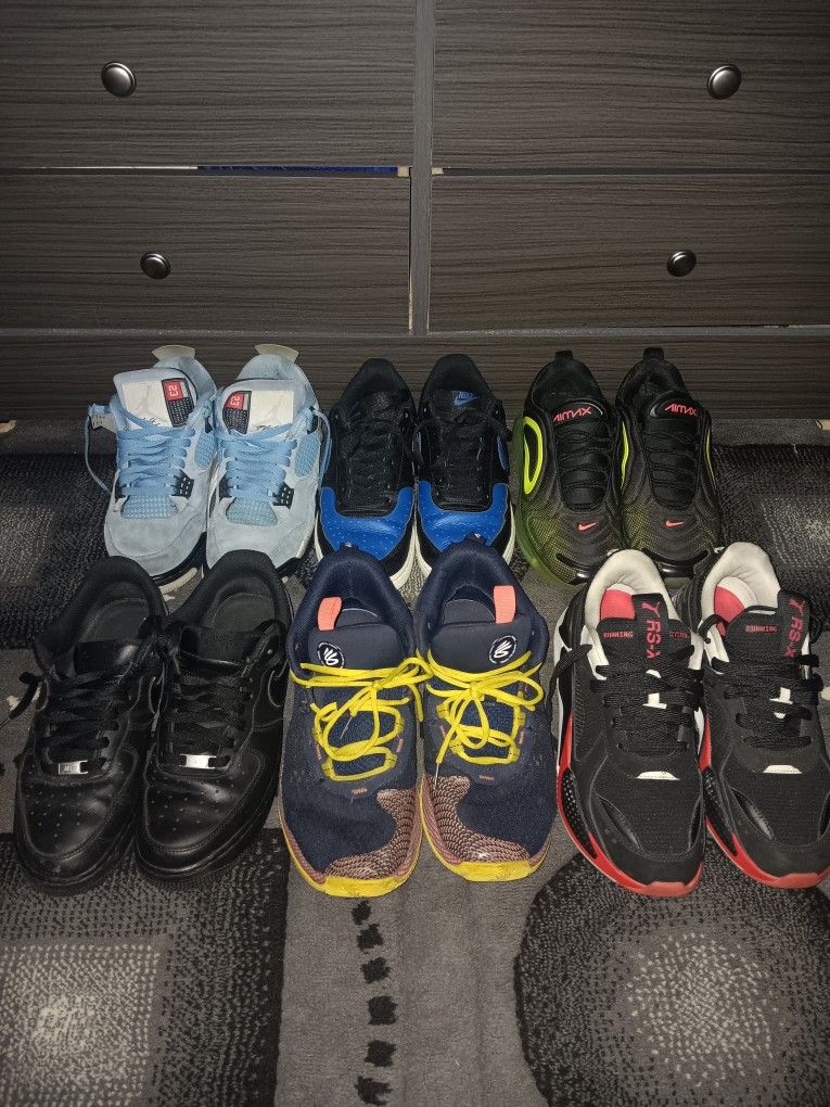 All these shoes are good condition wear, no boxes, $240 all together. Size 9.5 M / Jordan 4 Retro - $80 Size 10 M Black AF1 - $35 Size 10.5 M / Nike Vision Low - $35 Size 9 W / Nike Air Max Neon Retro - $50 Size 10 M / Under Armour Curry HOVR Splash - $40 Size 10 M / Puma RS-X Road - $50 Dm for questions, Pick up only. All shoes are Negotiable, Buy more, you get a deal.