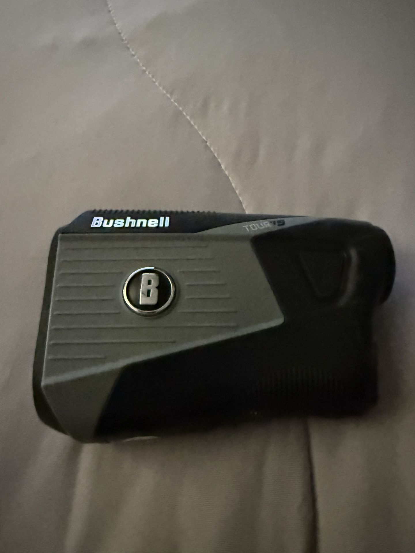Bushnell TourI5 range finder with bite to stick to most metal posts esp on golf carts. Has slope option