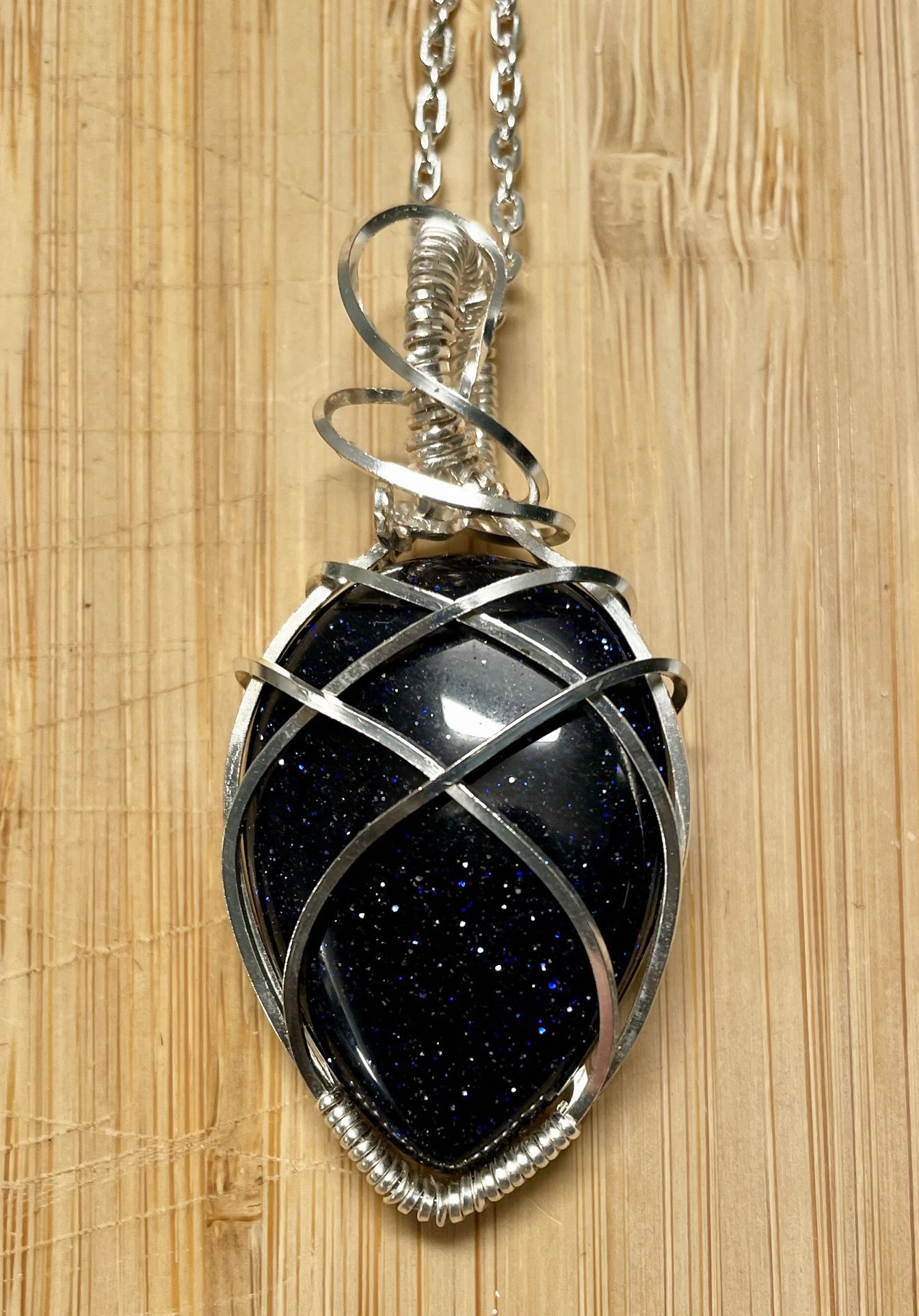 Handcrafted midnight blue goldstone pendant wrapped in flowing tarnish-resistant silver-plated wire and sealed with Renaissance Wax to help preserve shine and extend the life of the finish. This deep navy stone sparkles beautifully in the light, resembling a tiny galaxy. The silver wire design cradles the stone securely while adding an elegant, organic flow. The back is fully finished and detailed for a clean, professional look. ✨ Details: • Stone: Midnight Blue Goldstone • Wire: Tarnish-resistant silver-plated • Protection: Sealed with Renaissance Wax • Chain: 18-inch silver-tone chain included • Pendant size: Approx. 1.75–2 inches • Comes in gift box – ready for gifting