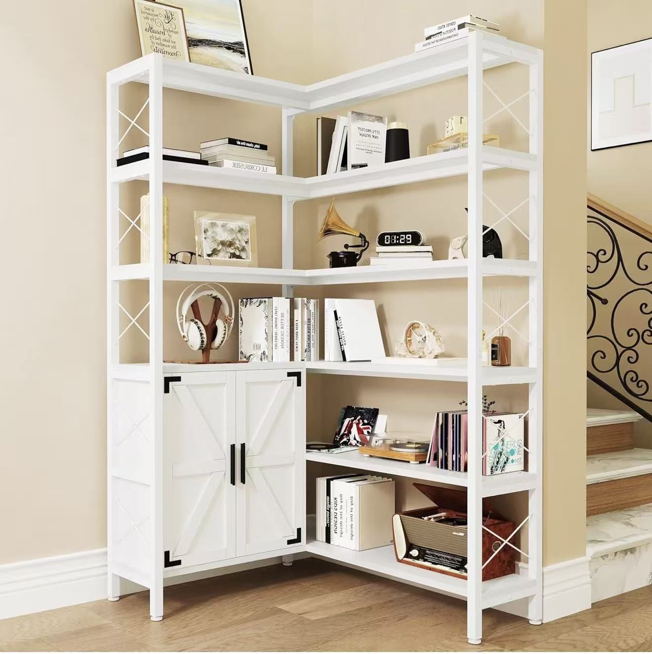 6-Shelf Corner Bookshelf, Vintage Industrial Corner Shelf Etagere Bookcase, Large Book Shelf with Metal Frame Open Storage Corner Cabinet (YYB0041-6GCW)