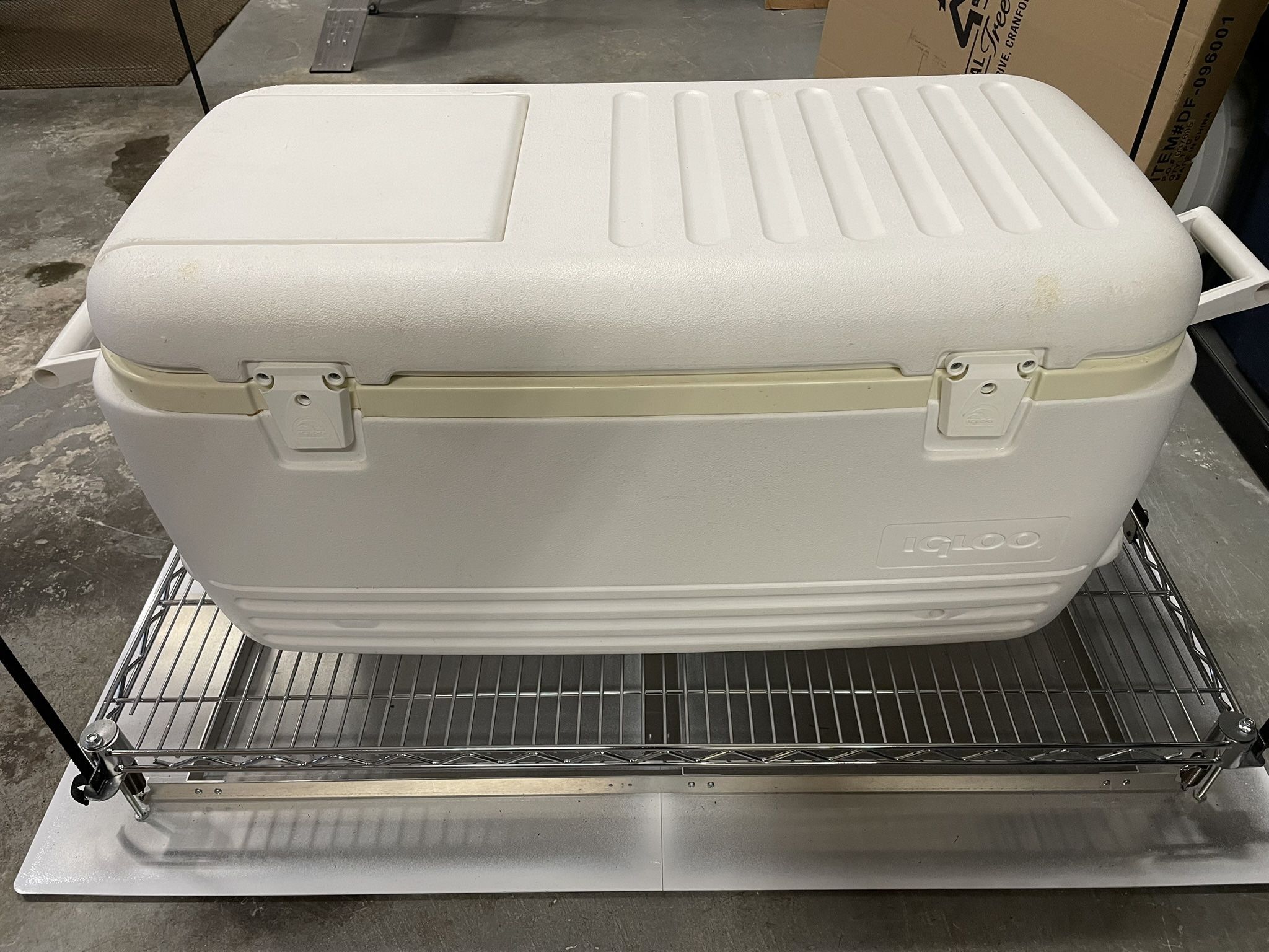 Larger cooler box has the following features: Lid is fastened to box by three hinges and is closed securely by two latches. Lid has a quick access lid built into it allowing for access without exposing container contents to elements. Has two handles, one on each end, and a drain spout which allows ice melt to drain when opened. Has loops above the handles to allow tie downs to hold cooler in place. Ice will last up to 5 days if the cooler is completely filled with ice. This cooler is perfect for the fisherman to keep their catch cold. Learn more about this cooler at https://offerup.com/redirect/?o=aHR0cHM6Ly95b3V0dWJlLmNvbS93YXRjaD92PWJhVlZIdUdia25Z