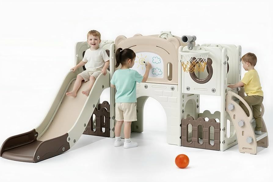 B467 $95 10-in-1 Large Toddler Slide Set, Kids Slide Climber Playset with Drawing Board, Basketball Hoop, Sturdy Baby Playground, Indoor Outdoor Playhouse for Boys and Girls Upgraded (Beige & Brown) Product Dimensions 68.9"L x 61"W x 37.4"H Color Beige & Brown Maximum Weight Recommendation 110 Pounds Assembly Required Yes ASTM & CPSIA CERTIFIED: Toddler slide is crafted from sturdy HDPE material and complies with ASTM/CPSIA safety standards. It supports up to 110 lbs and is equipped with rounded edges, non-slip steps, and buffer slide, providing secure environment encourages your child's growth and discovery UPGRADED DESIGN: Outdoor indoor playground has stable triangular frame prevents tipping and minimizes sway. With its drawing board, kids can enjoy both active play and creative activities for well-rounded development 10-IN-1 TODDLER PLAYGROUND: Kids climber slide playset combines 10 fun activity stations into one, including slide, climber, telescope, hide-and-seek, corridor, drawing board, storage space, tunnel, basketball hoop, and wheel. It's dedicated play zone for endless fun, and creative space sparks imagination development INDOOR OUTDOOR ADVENTURE: Baby castle slide offers versatile placement for both indoor and outdoor use and folds easily for compact storage. It grows with your child to provide lasting fun from the toddler years and beyond. Dimension: 68.9"L x 61"W x 37.4"H EASY ASSEMBLY: Sturdy upgraded slide playhause enables easy 30-minute assembly with clear instructions that have you set up and enjoying family fun in no time ly-73
