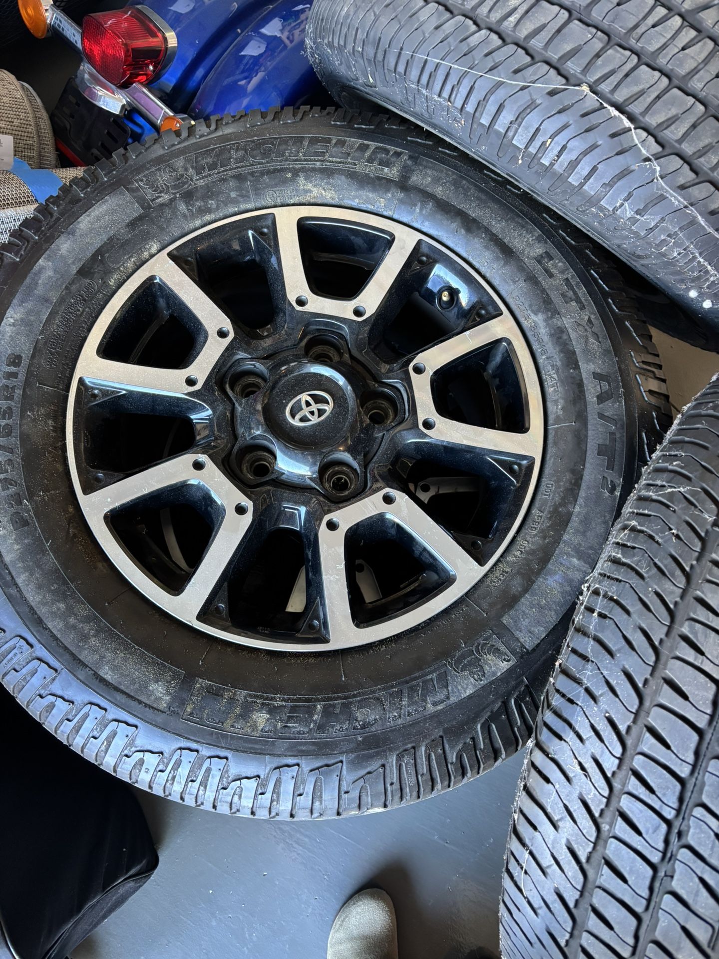Selling a full set of 4 Toyota OEM 18” rims with Michelin LTX A/T2 tires. • Tire Size: P275/65R18 • Brand: Michelin LTX A/T2 • 6-lug Toyota factory wheels • Includes center caps • Tires hold air • Normal wear – see photos for condition Came off a Toyota Tacoma. Great set for daily driving, spare set, or upgrade.