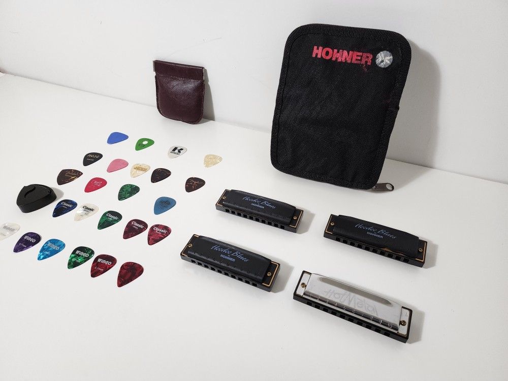 Lot of 4 Hohner Hot Metal Harmonica & Hohner Hoodoo Blue Harmonicas With Case & 24 Assorted Guitar Picks & Cases $265 ● Lot of 4 Hohner Hot Metal Harmonica & Hohner Hoodoo Blue Harmonicas With Case All for $145 ○ Hohner Hot Metal Harmonica ○ Hohner Hoodoo Blues Harmonica 3-Pack ● 24 Assorted Guitar Picks & Cases All for $120 24 assorted guitar, various brands